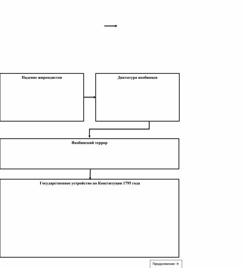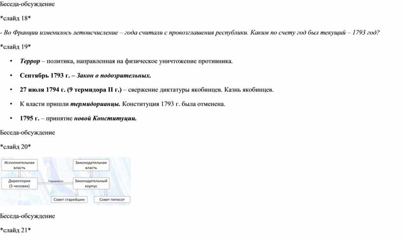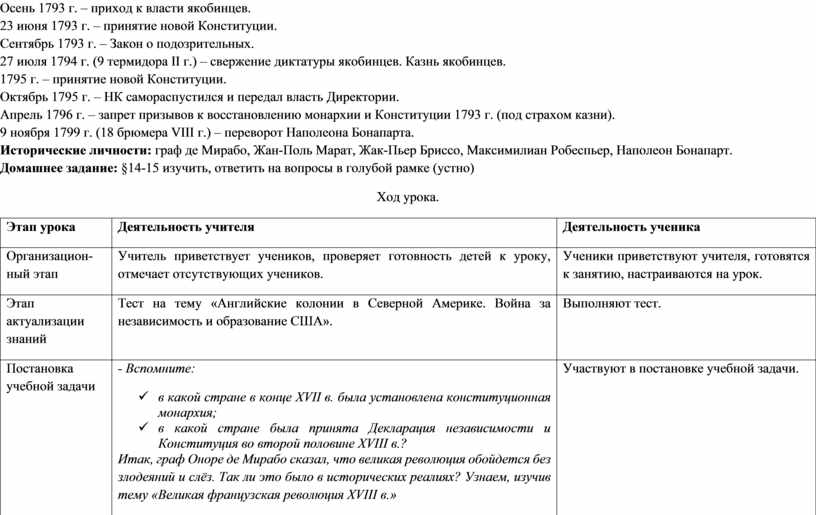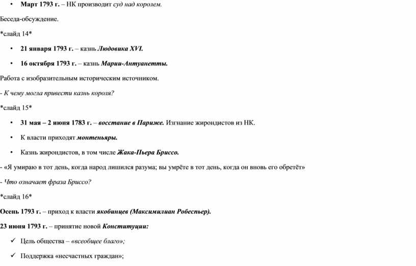 Беседа-обсуждение, работа со схемой. *слайд 11* • Иностранные государства начинают войну против французских революционеров. • Людовик XVI поддерживает войну. - Почему иностранные государства боролись с Французской революцией? Почему король поддержал их? Беседа-обсуждение. *слайд 12* Недовольство городских низов – санкюлотов: ü Считали, что ничего не получили от революции. Издание газеты «Друг народа» - Жан-Поль Марат. Беседа-обсуждение. *слайд 13* • 11 июня 1792 г. – обвинение королевской семьи: «Отечество в опасности!» • 10 августа 1792 г. – штурм Тюильри. Арест королевской семьи. • Падение монархии, роспуск Законодательного собрания, выборы в Национальный конвент. • 21 сентября 1792 г. – НК провозглашает Францию республикой. • Март 1793 г. – НК производит суд над королем. Беседа-обсуждение. *слайд 14* • 21 января 1793 г. – казнь Людовика XVI. • 16 октября 1793 г. – казнь Марии-Антуанетты. Работа с изобразительным историческим источником. - К чему могла привести казнь короля? *слайд 15* • 31 мая – 2 июня 1783 г. – восстание в Париже. Изгнание жирондистов из НК. • К власти приходят монтеньяры. • Казнь жирондистов, в том числе Жака-Пьера Бриссо. - «Я умираю в тот день, когда народ лишился разума; вы умрёте в тот день, когда он вновь его обретёт» - Что означает фраза Бриссо? *слайд 16* Осень 1793 г. – приход к власти якобинцев (Максимилиан Робеспьер). 23 июня 1793 г. – принятие новой Конституции: ü Цель общества – «всеобщее благо»; ü Поддержка «несчастных граждан»; ü Демократические нормы. Конституция одобрена на референдуме. Беседа-обсуждение. *слайд 17* НК ввёл временный революционный порядок управления = установление диктатуры якобинцев. ü Вся власть в руках НК; ü В департаменты и армии направлялись комиссары Конвента с неограниченными возможностями; ü Введение системы мер и весов; ü Введение революционного календаря (брюмер, термидор и т.д.); ü Отмена феодальных повинностей (барщина, оброк); ü Установление максимумов цен на товары первой необходимости. Беседа-обсуждение *слайд 18* - Во Франции изменилось летоисчисление – года считали с провозглашения республики. Каким по счету год был текущий – 1793 год? *слайд 19* • Террор – политика, направленная на физическое уничтожение противника. • Сентябрь 1793 г. – Закон о подозрительных. • 27 июля 1794 г. (9 термидора II г.) – свержение диктатуры якобинцев. Казнь якобинцев. • К власти пришли термидорианцы. Конституция 1793 г. была отменена. • 1795 г. – принятие новой Конституции. Беседа-обсуждение *слайд 20*