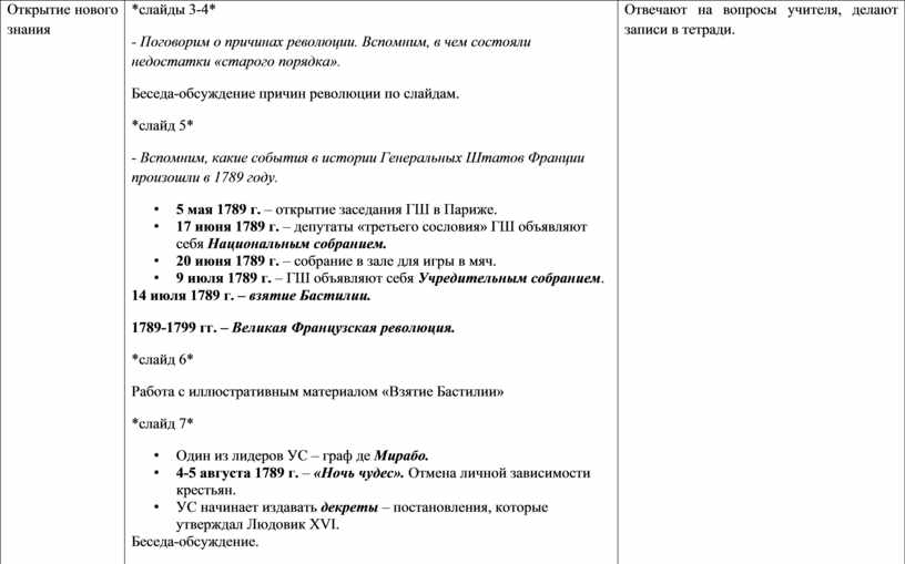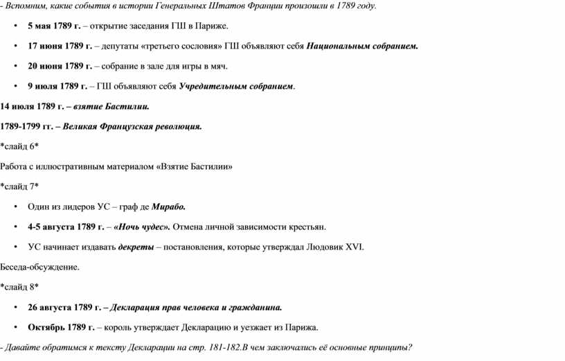 *слайды 3-4* - Поговорим о причинах революции. Вспомним, в чем состояли недостатки «старого порядка». Беседа-обсуждение причин революции по слайдам. *слайд 5* - Вспомним, какие события в истории Генеральных Штатов Франции произошли в 1789 году. • 5 мая 1789 г. – открытие заседания ГШ в Париже. • 17 июня 1789 г. – депутаты «третьего сословия» ГШ объявляют себя Национальным собранием. • 20 июня 1789 г. – собрание в зале для игры в мяч. • 9 июля 1789 г. – ГШ объявляют себя Учредительным собранием. 14 июля 1789 г. – взятие Бастилии. 1789-1799 гг. – Великая Французская революция. *слайд 6* Работа с иллюстративным материалом «Взятие Бастилии» *слайд 7* • Один из лидеров УС – граф де Мирабо. • 4-5 августа 1789 г. – «Ночь чудес». Отмена личной зависимости крестьян. • УС начинает издавать декреты – постановления, которые утверждал Людовик XVI. Беседа-обсуждение. *слайд 8* • 26 августа 1789 г. – Декларация прав человека и гражданина. • Октябрь 1789 г. – король утверждает Декларацию и уезжает из Парижа. - Давайте обратимся к тексту Декларации на стр. 181-182.В чем заключались её основные принципы? Работа с историческим источником. *слайд 9*