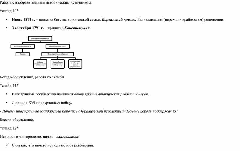 Появление новой символики Работа со схемой. Работа с изобразительным историческим источником. *слайд 10* • Июнь 1891 г. – попытка бегства королевской семьи. Вареннский кризис. Радикализация (переход к крайностям) революции. • 3 сентября 1791 г. – принятие Конституции.