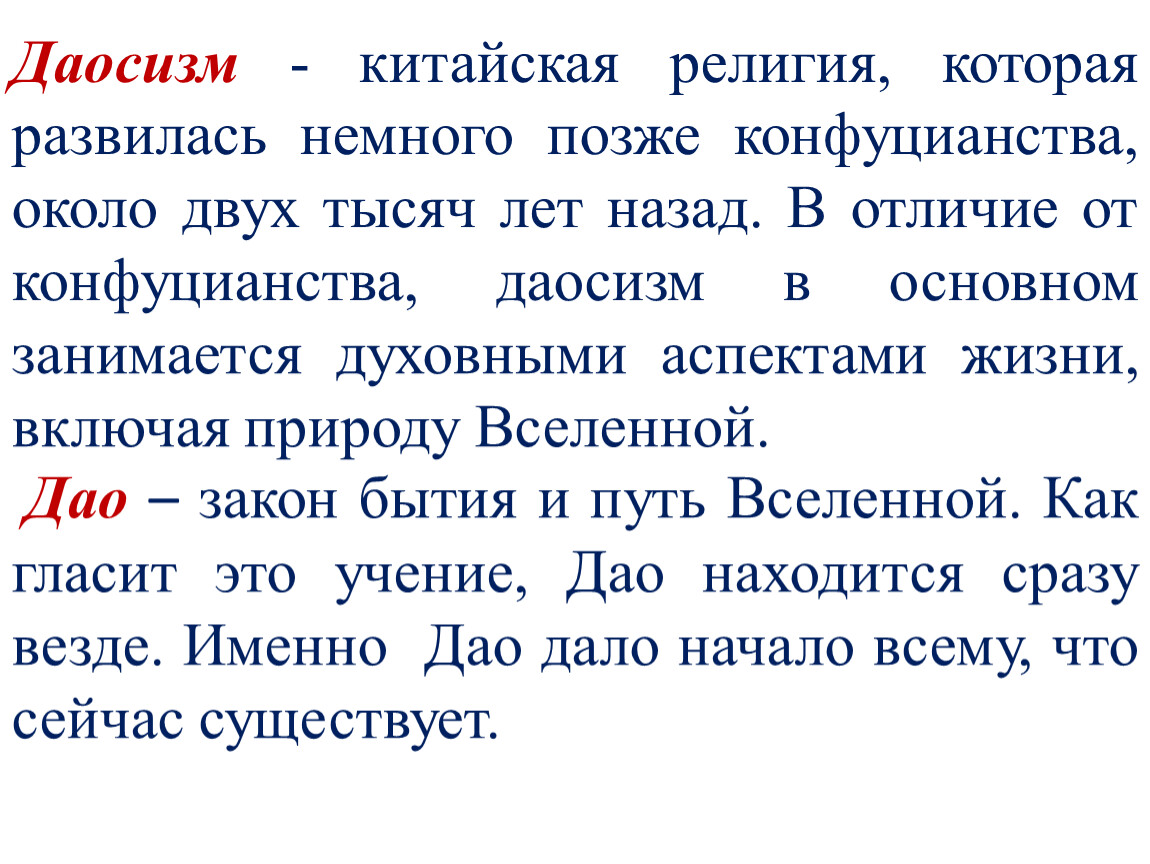 Даосизм - китайская религия, которая развилась немного позже конфуцианства, около двух тысяч лет назад. В отличие от конфуцианства, даосизм в основном занимается духовными аспектами жизни, включая природу Вселенной.