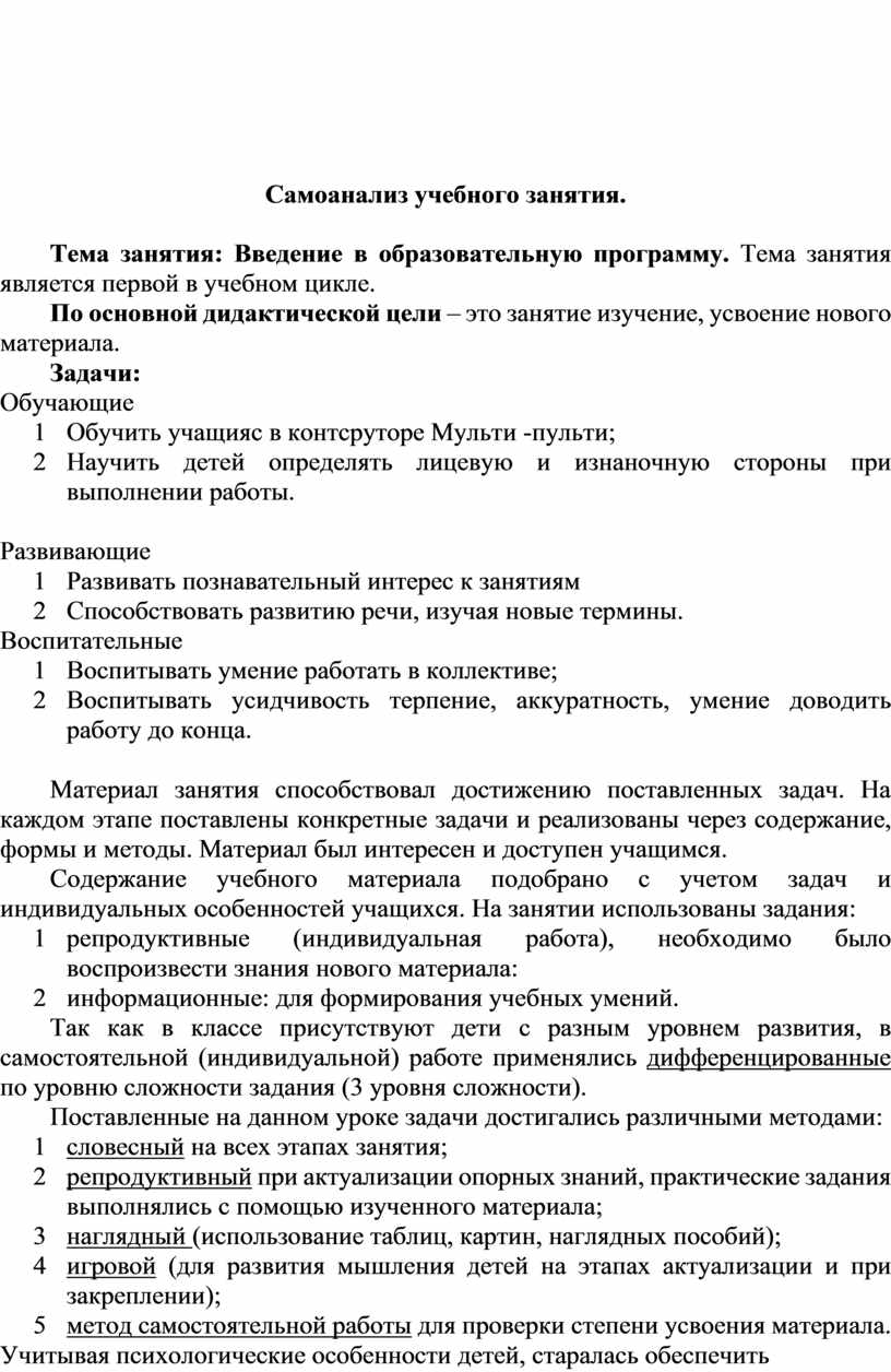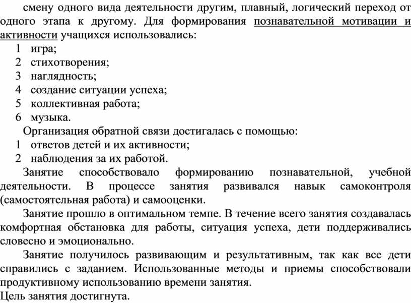 Занятие способствовало формированию познавательной, учебной деятельности. В процессе занятия развивался навык самоконтроля (самостоятельная работа) и самооценки.
