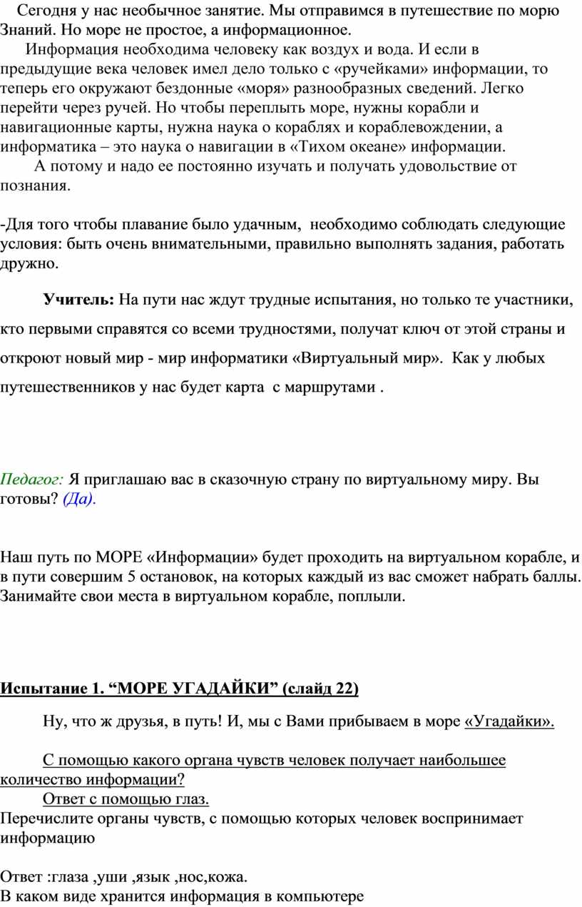 Сегодня у нас необычное занятие. Мы отправимся в путешествие по морю Знаний. Но море не простое, а информационное.