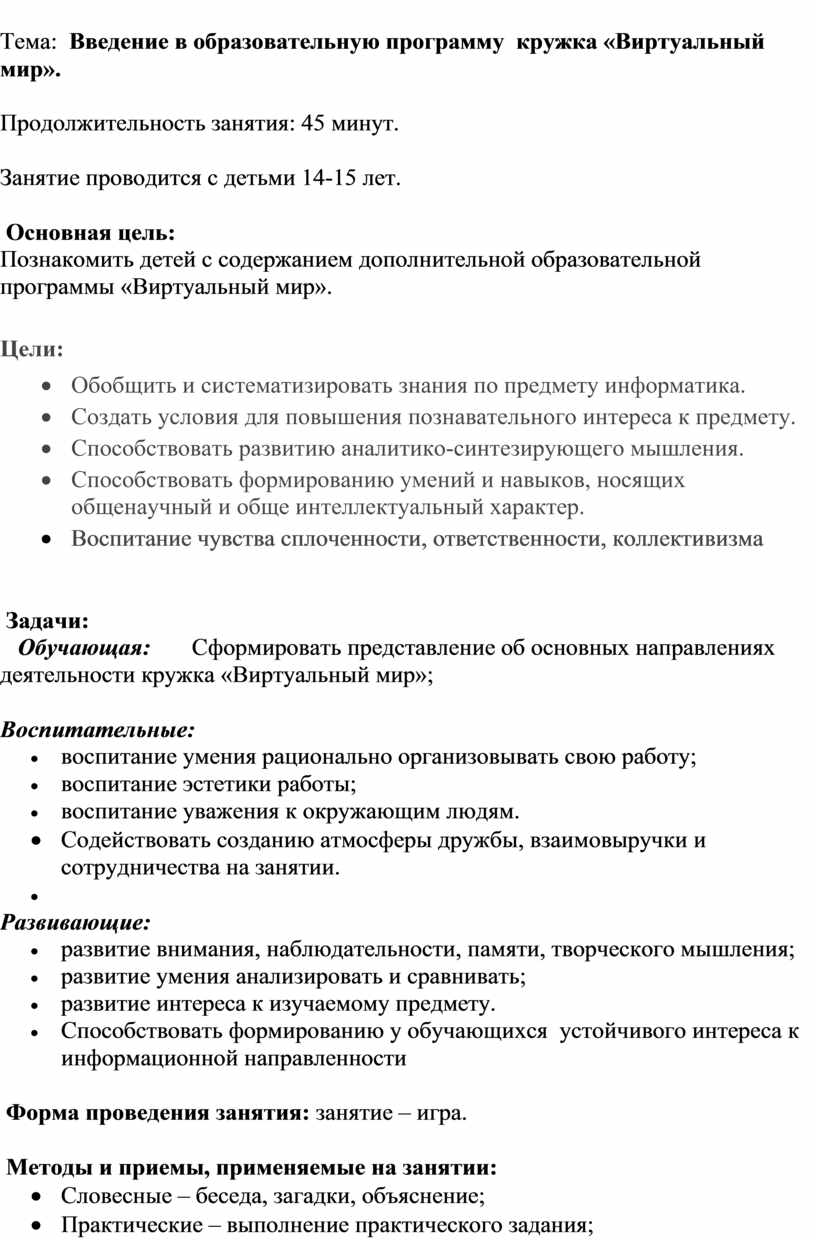 Тема: Введение в образовательную программу кружка «Виртуальный мир».