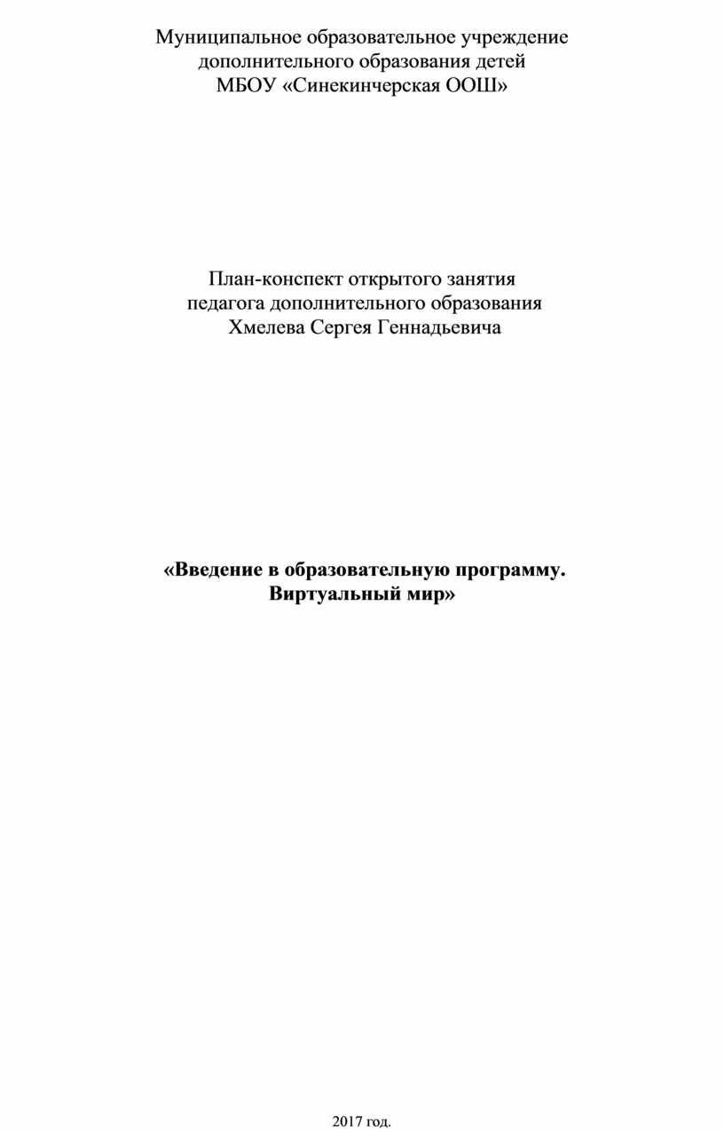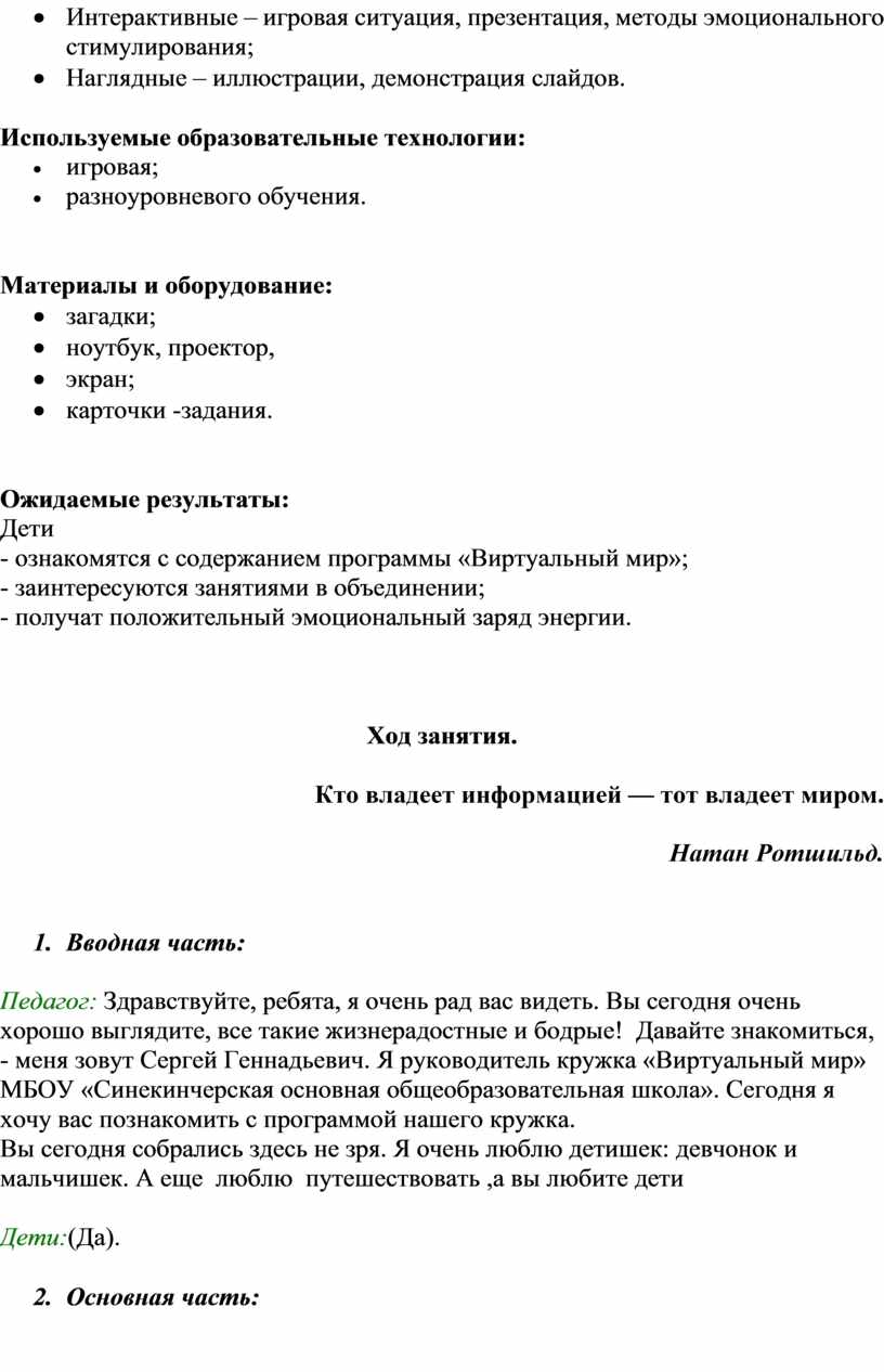 Педагог: Здравствуйте, ребята, я очень рад вас видеть. Вы сегодня очень хорошо выглядите, все такие жизнерадостные и бодрые! Давайте знакомиться, - меня зовут Сергей Геннадьевич. Я руководитель кружка «Виртуальный мир» МБОУ «Синекинчерская основная общеобразовательная школа». Сегодня я хочу вас познакомить с программой нашего кружка.