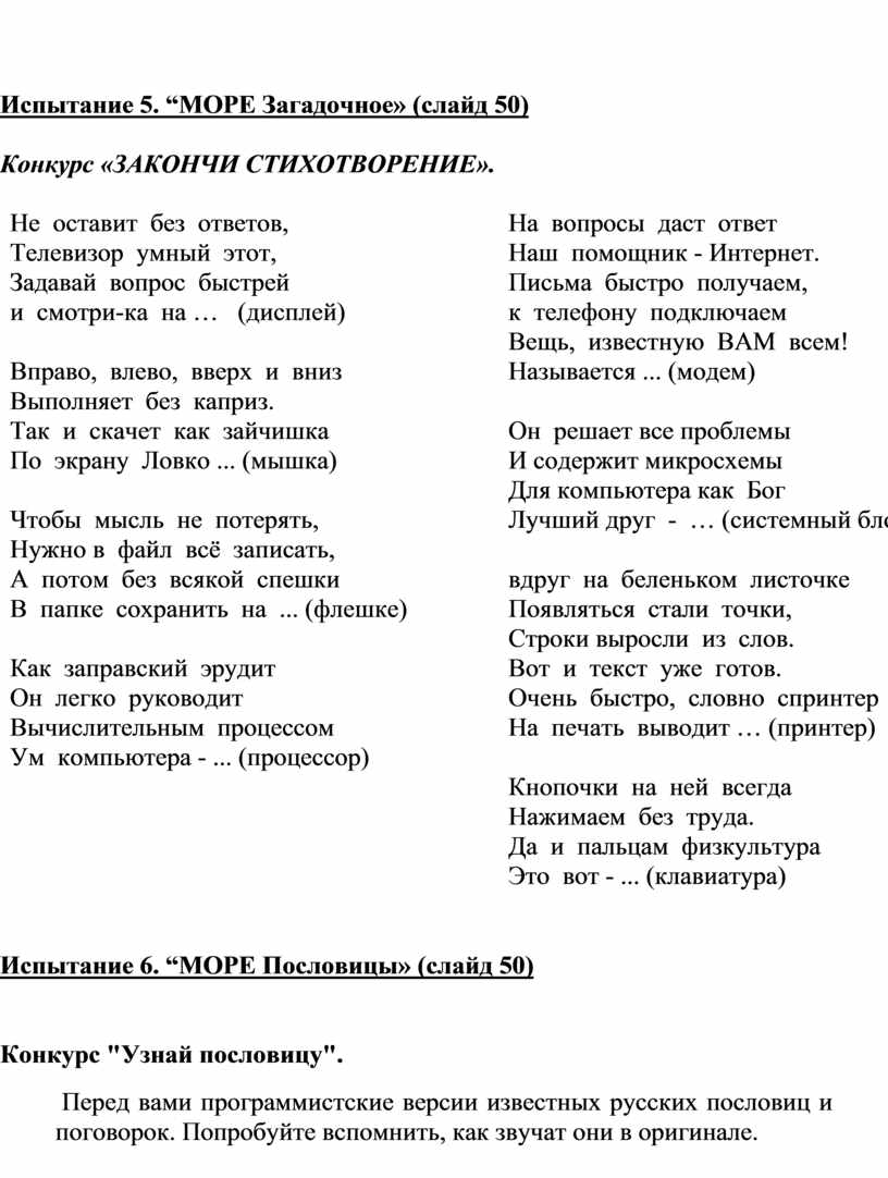 Испытание 6. “МОРЕ Пословицы» (слайд 50)