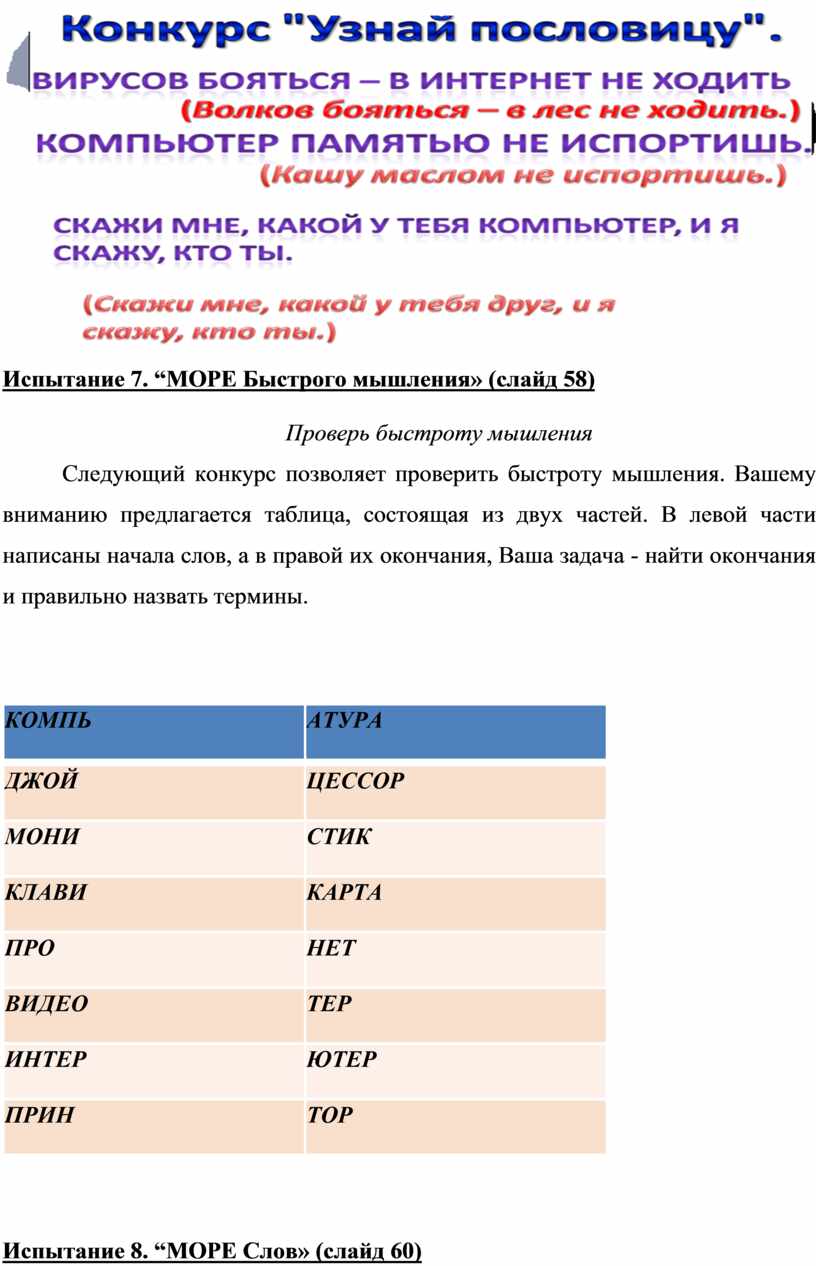 Испытание 8. “МОРЕ Слов» (слайд 60)