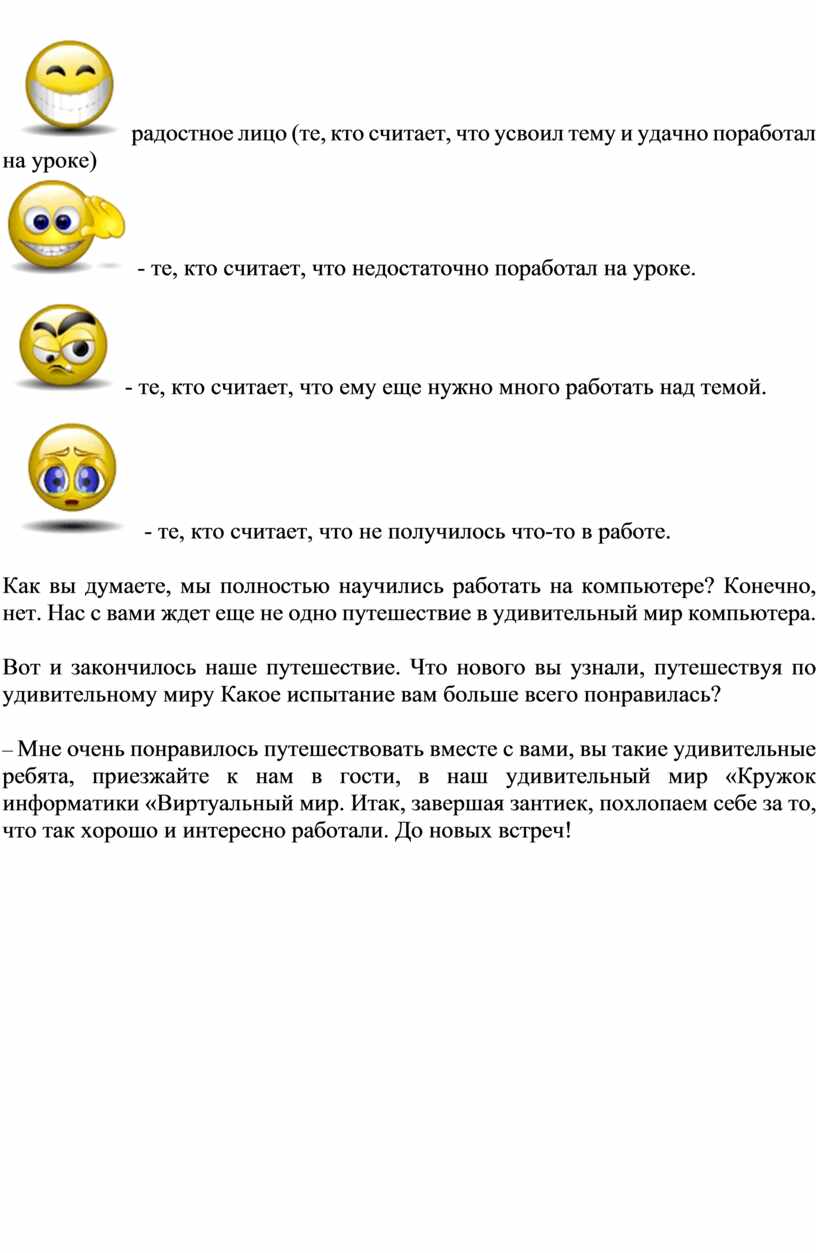 – Мне очень понравилось путешествовать вместе с вами, вы такие удивительные ребята, приезжайте к нам в гости, в наш удивительный мир «Кружок информатики «Виртуальный мир. Итак, завершая зантиек, похлопаем себе за то, что так хорошо и интересно работали. До новых встреч!