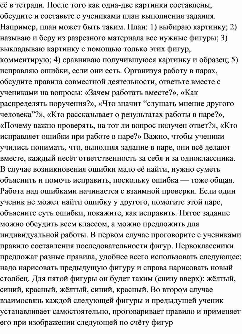 Игру целесообразно повторить и на следующем уроке. Основная задача выполнения следующих двух заданий — учить комментировать ход выкладывания картинки-образца («Расскажи, как сложить, сложи»). Работа первоклассников может быть организована разными способами. 1. Учитель показывает, как нужно выполнить задание, ученики дублируют каждый шаг. 2. Один ученик рассказывает, как сложить, а все складывают. 3. Каждый ученик выбирает понравившуюся фигуру и выкладывает её в тетради. После того как одна-две картинки составлены, обсудите и составьте с учениками план выполнения задания. Например, план может быть таким. План: 1) выбираю картинку; 2) называю и беру из разрезного материала все нужные фигуры; 3) выкладываю картинку с помощью только этих фигур, комментирую; 4) сравниваю получившуюся картинку и образец; 5) исправляю ошибки, если они есть. Организуя работу в парах, обсудите правила совместной деятельности, ответьте вместе с учениками на вопросы: «Зачем работать вместе?», «Как распределять поручения?», «Что значит “слушать мнение другого человека”?», «Кто рассказывает о результатах работы в паре?», «Почему важно проверять, на тот ли вопрос получен ответ?», «Кто исправляет ошибки при работе в паре?» Важно, чтобы ученики учились понимать, что, выполняя задание в паре, они всё делают вместе, каждый несёт ответственность за себя и за одноклассника. В случае возникновения ошибки мало её найти, нужно суметь объяснить и помочь исправить, поскольку ошибка — тоже общая. Работа над ошибками начинается с взаимной проверки. Если один ученик не может найти ошибку у другого, помогите этой паре, объясните суть ошибки, покажите, как исправить. Пятое задание можно обсудить всем классом, а можно предложить для индивидуальной работы. В первом случае проговорите с учениками правило составления последовательности фигур. Первоклассники предложат разные правила, удобнее всего использовать следующее: надо нарисовать предыдущую фигуру и справа нарисовать новый столбец. Для пятой фигуры он будет таким (снизу вверх): жёлтый, синий, красный, жёлтый, синий, красный. Во втором случае взаимосвязь каждой следующей фигуры и предыдущей ученик устанавливает самостоятельно, проговаривает правило и применяет его при изображении следующей по счёту фигур
