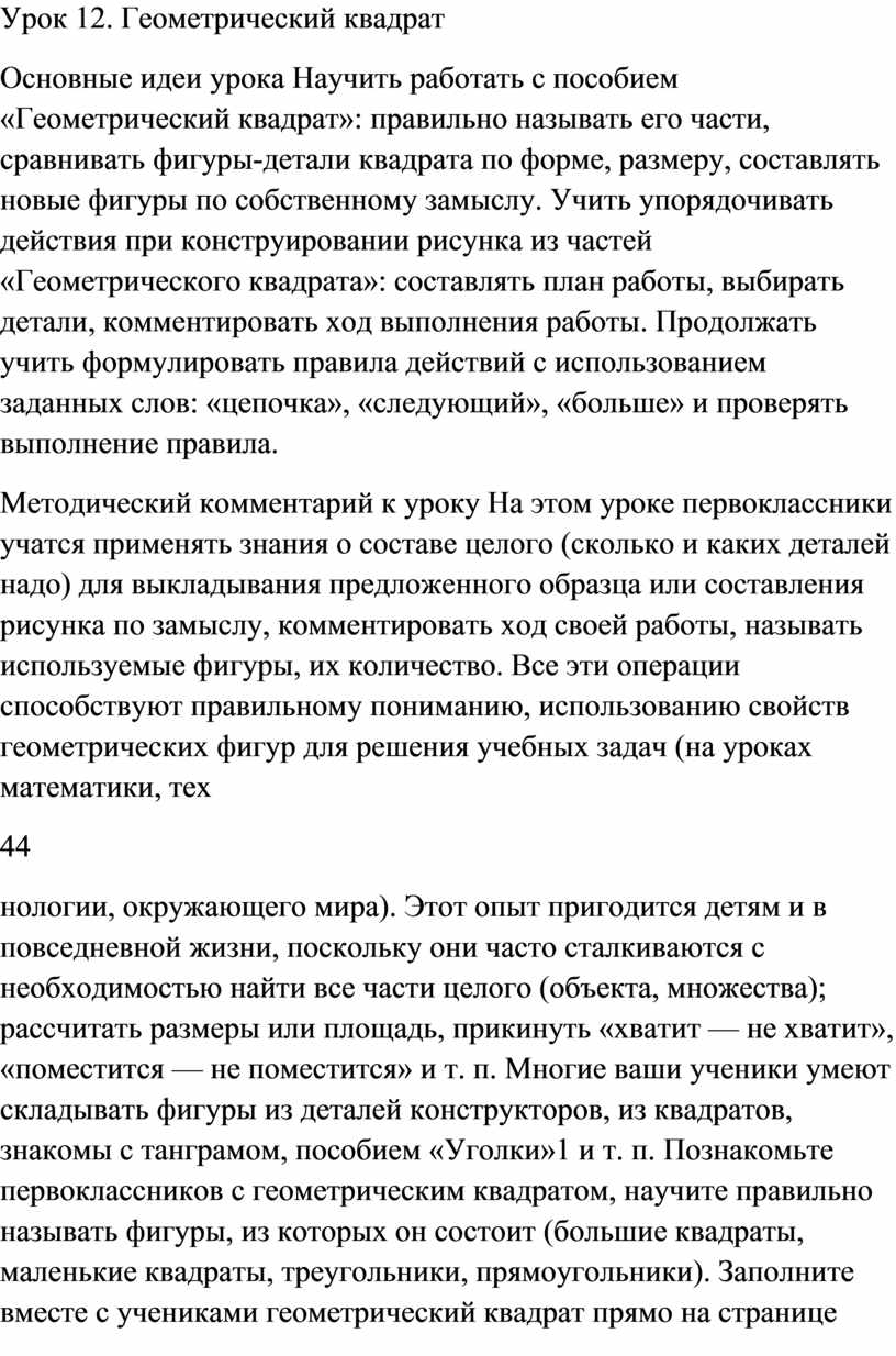 нологии, окружающего мира). Этот опыт пригодится детям и в повседневной жизни, поскольку они часто сталкиваются с необходимостью найти все части целого (объекта, множества); рассчитать размеры или площадь, прикинуть «хватит — не хватит», «поместится — не поместится» и т. п. Многие ваши ученики умеют складывать фигуры из деталей конструкторов, из квадратов, знакомы с танграмом, пособием «Уголки»1 и т. п. Познакомьте первоклассников с геометрическим квадратом, научите правильно называть фигуры, из которых он состоит (большие квадраты, маленькие квадраты, треугольники, прямоугольники). Заполните вместе с учениками геометрический квадрат прямо на странице тетради, комментируя каждый шаг. Обсудите общее и различное большого