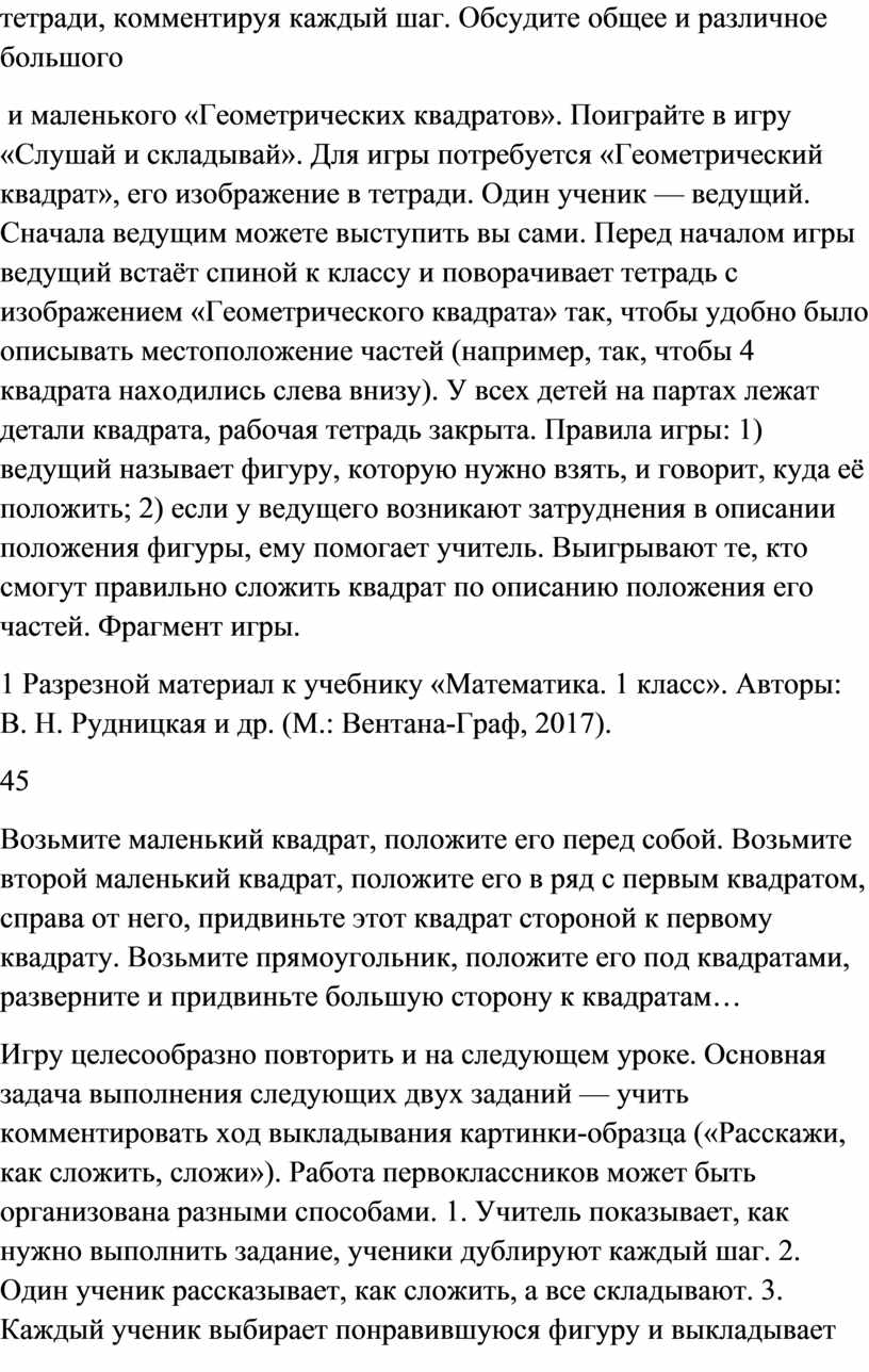и маленького «Геометрических квадратов». Поиграйте в игру «Слушай и складывай». Для игры потребуется «Геометрический квадрат», его изображение в тетради. Один ученик — ведущий. Сначала ведущим можете выступить вы сами. Перед началом игры ведущий встаёт спиной к классу и поворачивает тетрадь с изображением «Геометрического квадрата» так, чтобы удобно было описывать местоположение частей (например, так, чтобы 4 квадрата находились слева внизу). У всех детей на партах лежат детали квадрата, рабочая тетрадь закрыта. Правила игры: 1) ведущий называет фигуру, которую нужно взять, и говорит, куда её положить; 2) если у ведущего возникают затруднения в описании положения фигуры, ему помогает учитель. Выигрывают те, кто смогут правильно сложить квадрат по описанию положения его частей. Фрагмент игры.
