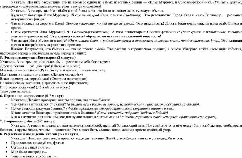 Учитель: Давайте рассмотрим это на примере одной из самых известных былин — «Илья Муромец и Соловей-разбойник». (Учитель кратко, выразительно пересказывает сюжет, есть в конце конспекта).