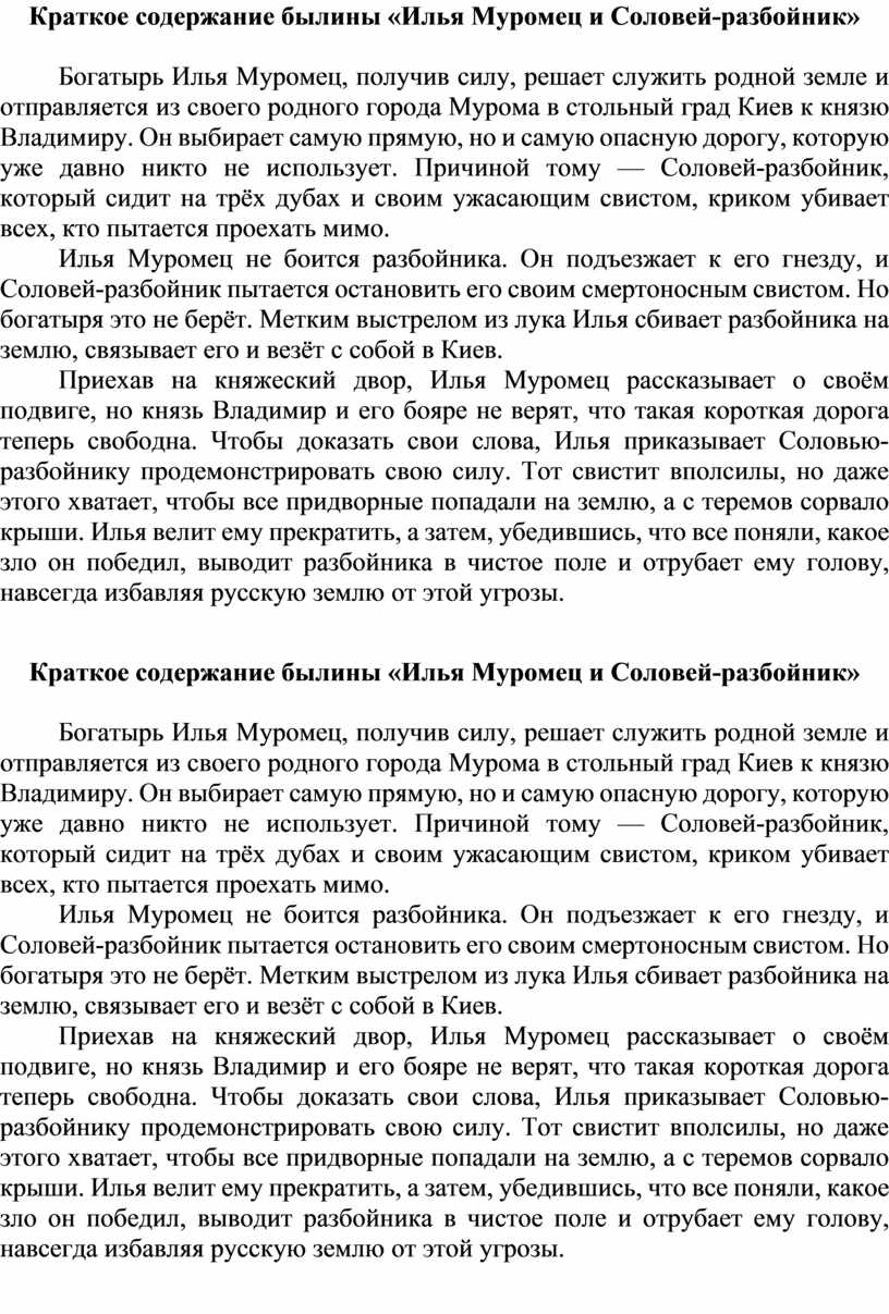 Прочитать и пересказать краткое содержание «Илья Муромец и Соловей-разбойник»
