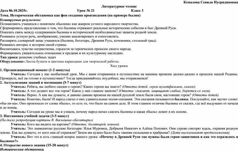 Учитель: Вы сегодня отлично поработали! Вы были внимательными, думающими и творческими. Вы узнали, что былины — это не просто старинные истории, это живая память нашего народа о его героическом прошлом.