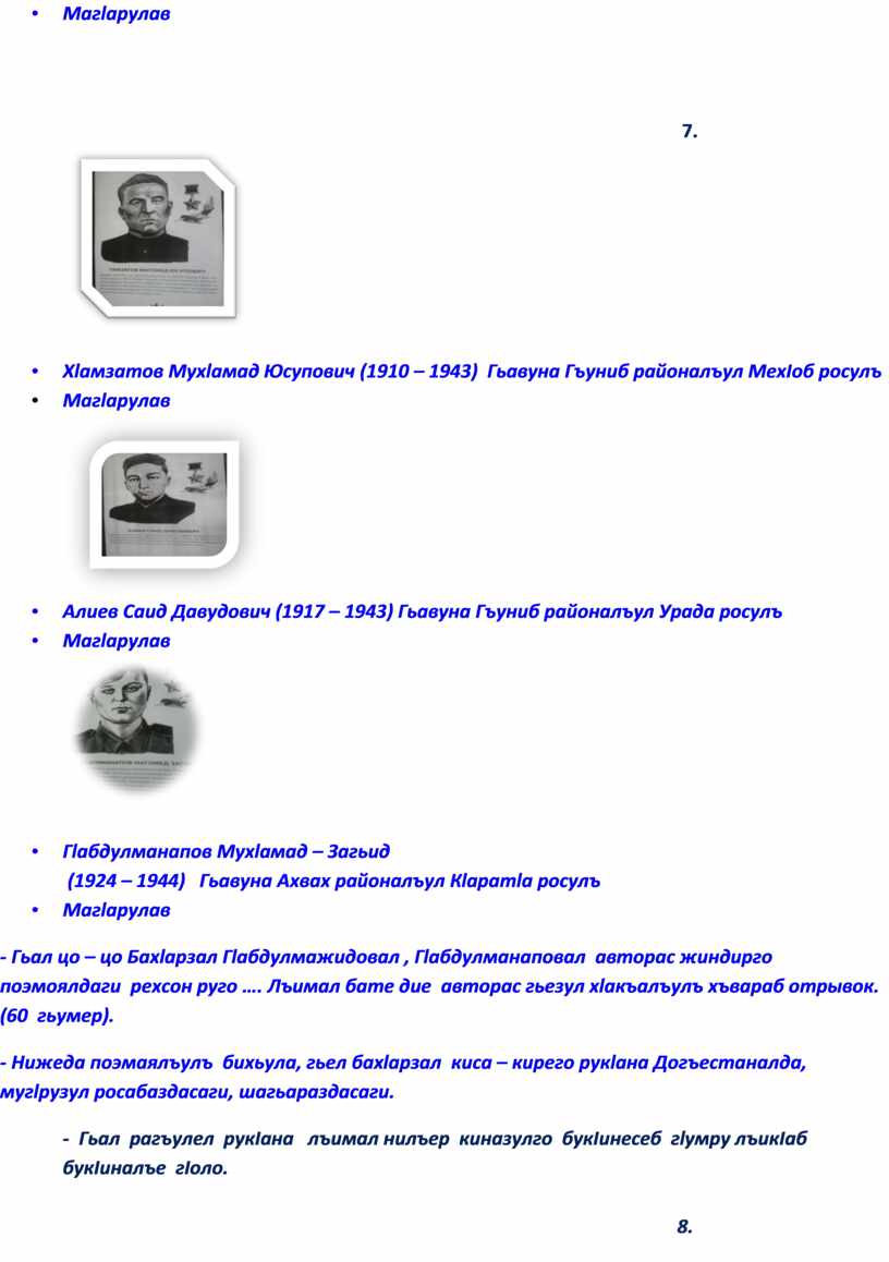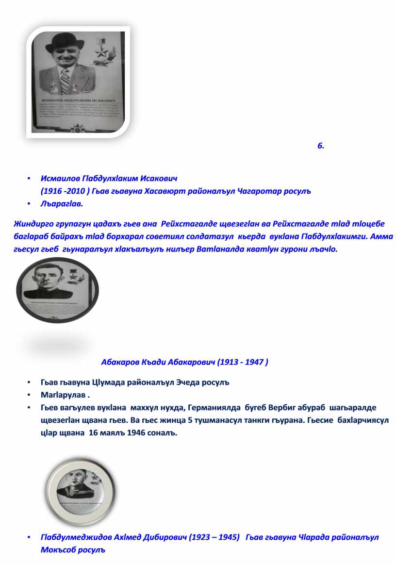 • Гlабдулмеджидов Ахlмед Дибирович (1923 – 1945) Гьав гьавуна Чlарада районалъул Мокъсоб росулъ