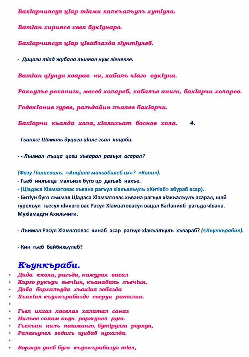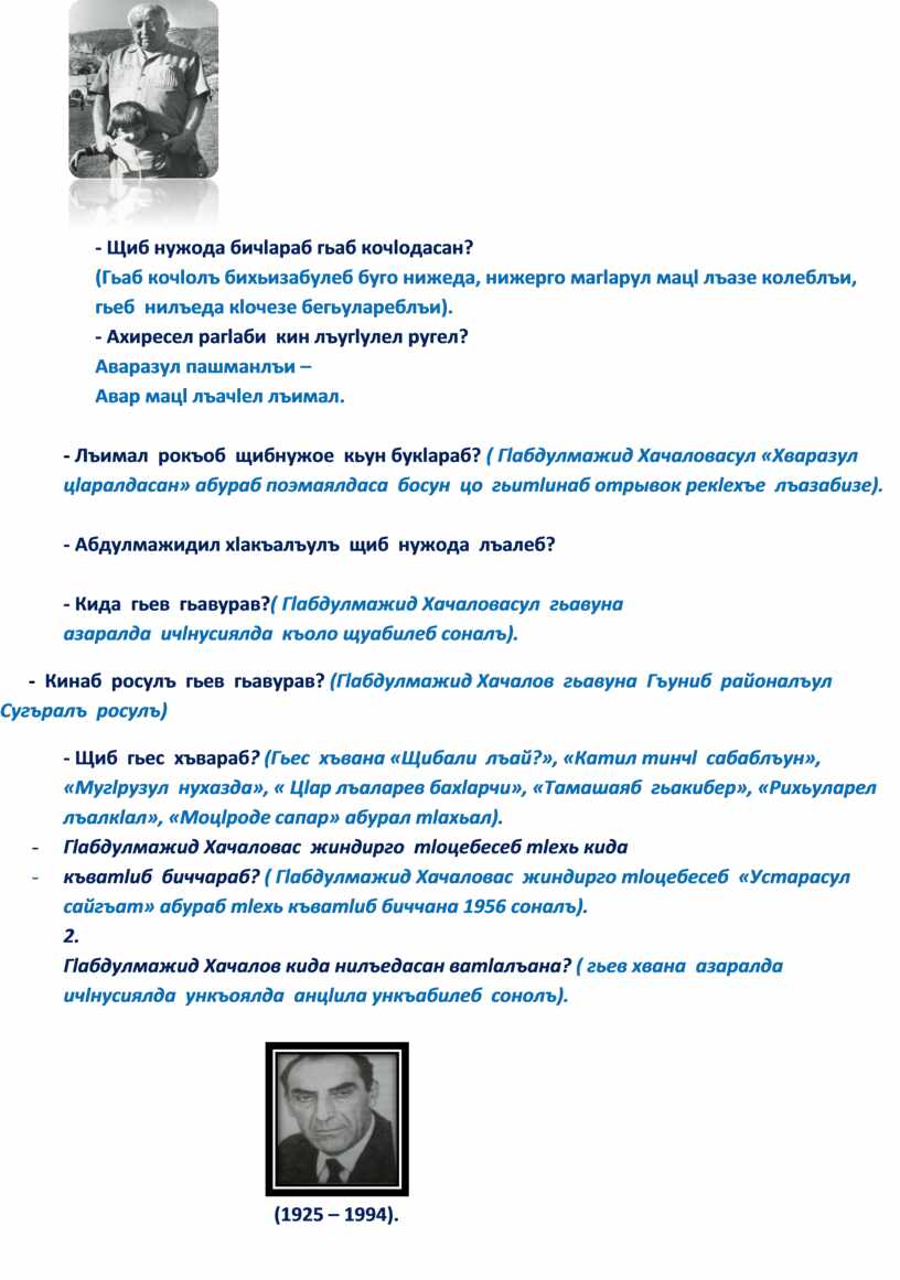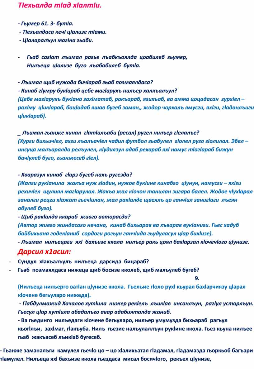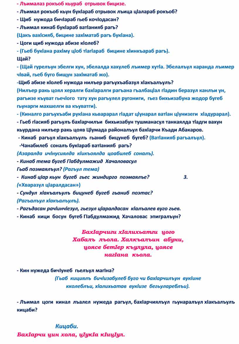 - Лъимал рокъоб щибнужое кьун букlараб? ( Гlабдулмажид Хачаловасул «Хваразул цlаралдасан» абураб поэмаялдаса босун цо гьитlинаб отрывок рекlехъе лъазабизе).