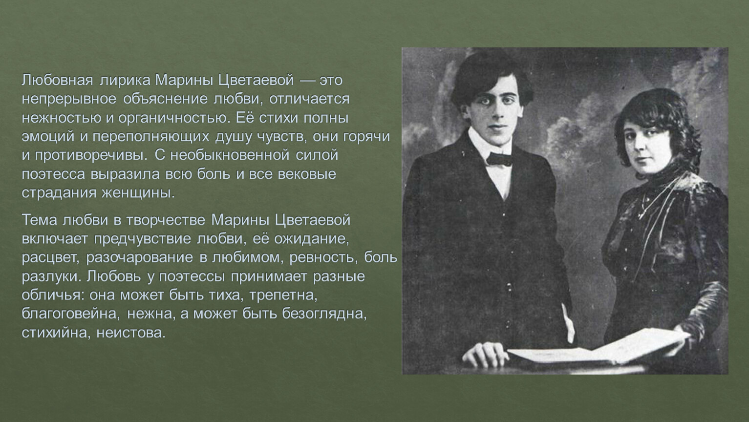 Любовная лирика Марины Цветаевой — это непрерывное объяснение любви, отличается нежностью и органичностью. Её стихи полны эмоций и переполняющих душу чувств, они горячи и противоречивы. С необыкновенной силой поэтесса выразила всю боль и все вековые страдания женщины.