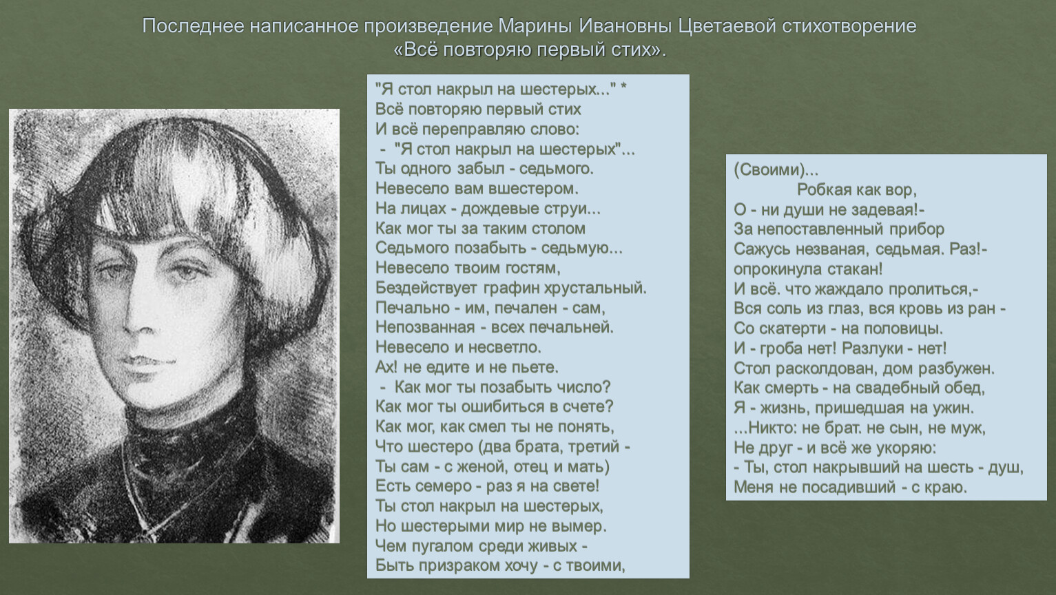 Последнее написанное произведение Марины Ивановны Цветаевой стихотворение «Всё повторяю первый стих».