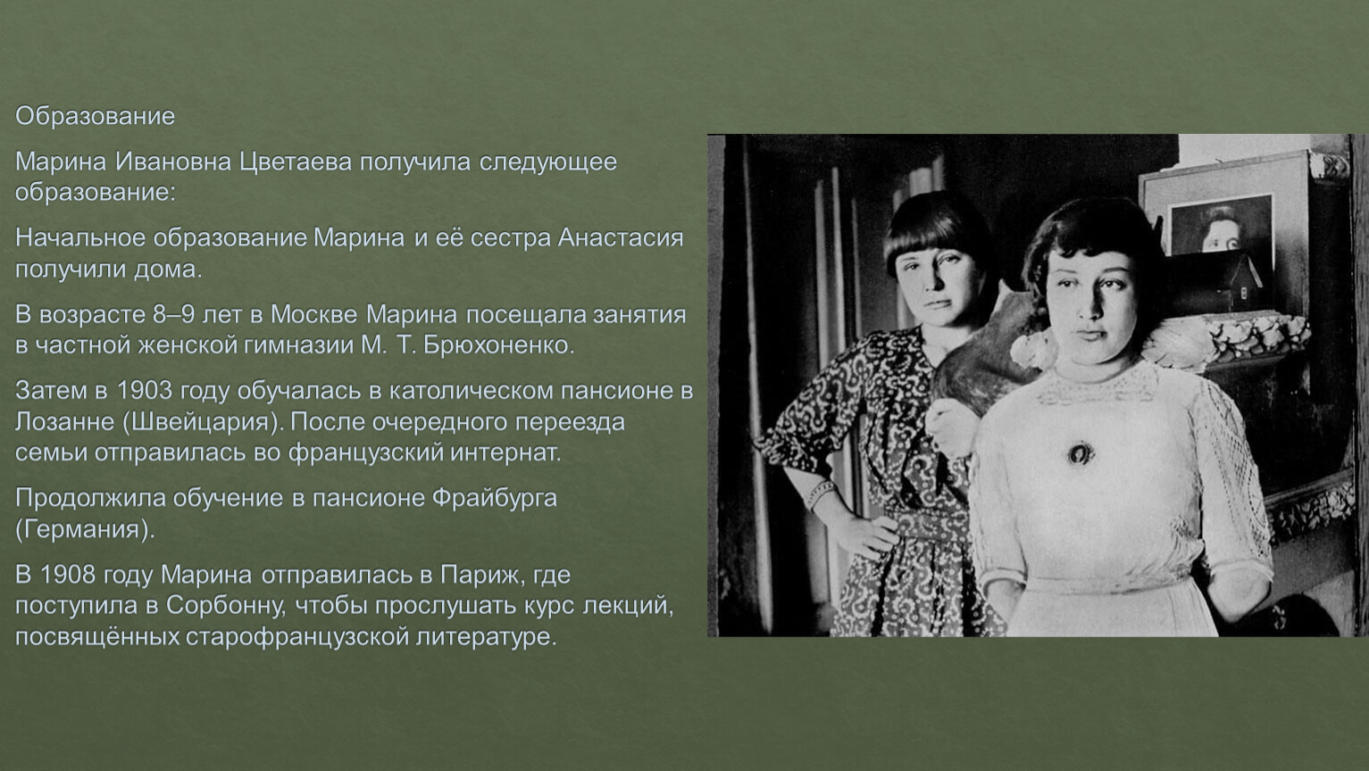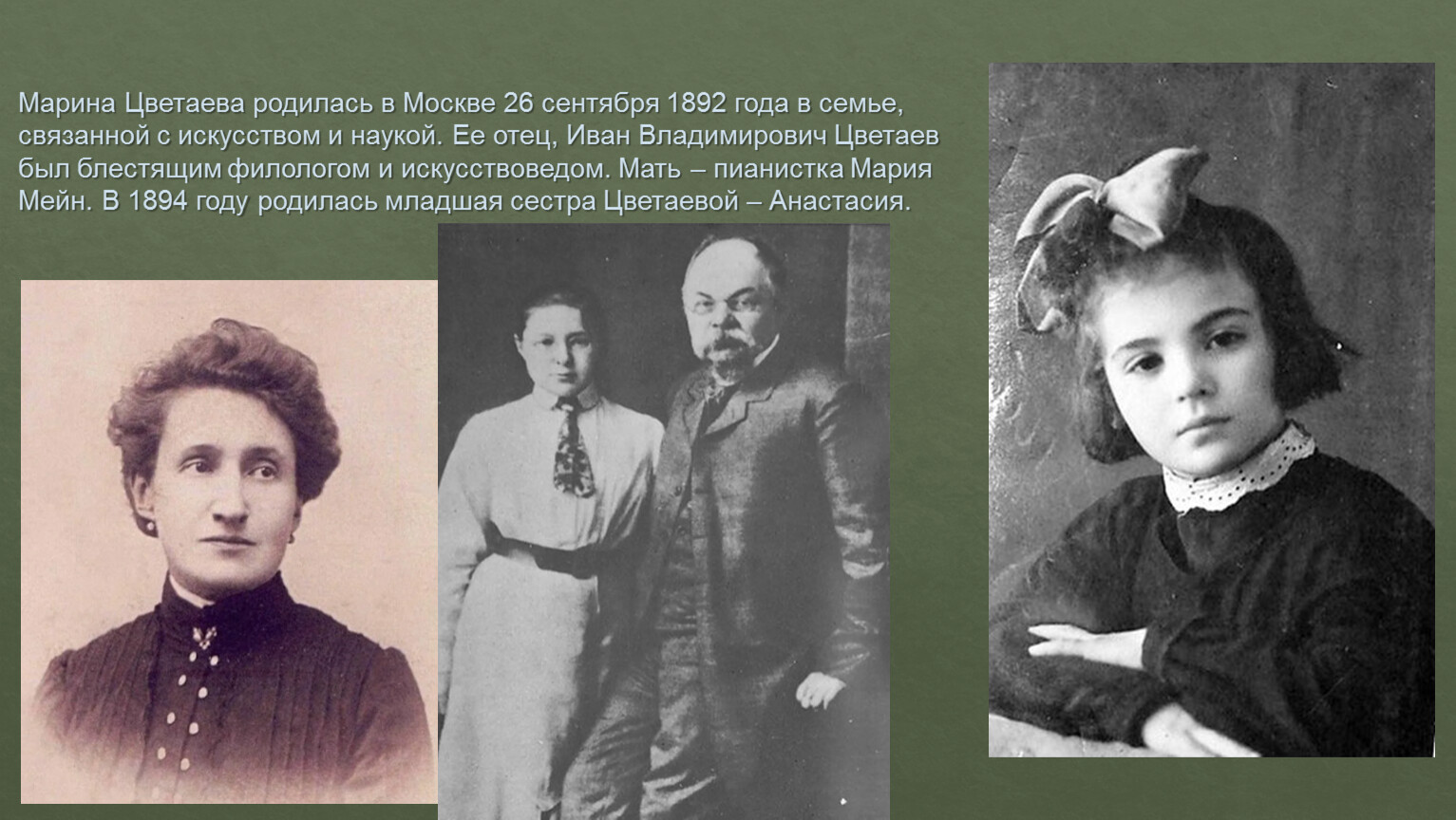 Марина Цветаева родилась в Москве 26 сентября 1892 года в семье, связанной с искусством и наукой. Ее отец, Иван Владимирович Цветаев был блестящим филологом и искусствоведом. Мать – пианистка Мария Мейн. В 1894 году родилась младшая сестра Цветаевой – Анастасия.