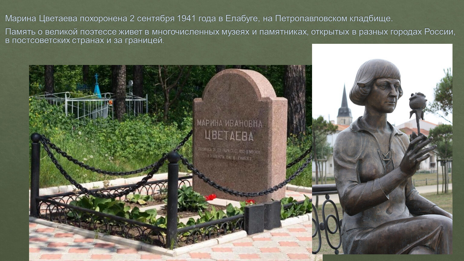 Марина Цветаева похоронена 2 сентября 1941 года в Елабуге, на Петропавловском кладбище.