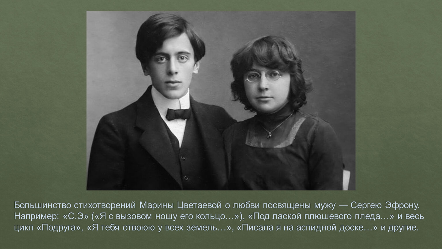 Большинство стихотворений Марины Цветаевой о любви посвящены мужу — Сергею Эфрону. Например: «С.Э» («Я с вызовом ношу его кольцо…»), «Под лаской плюшевого пледа…» и весь цикл «Подруга», «Я тебя отвоюю у всех земель…», «Писала я на аспидной доске…» и другие.
