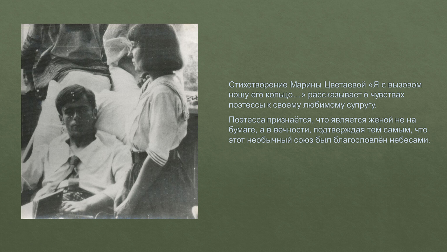 Стихотворение Марины Цветаевой «Я с вызовом ношу его кольцо…» рассказывает о чувствах поэтессы к своему любимому супругу.