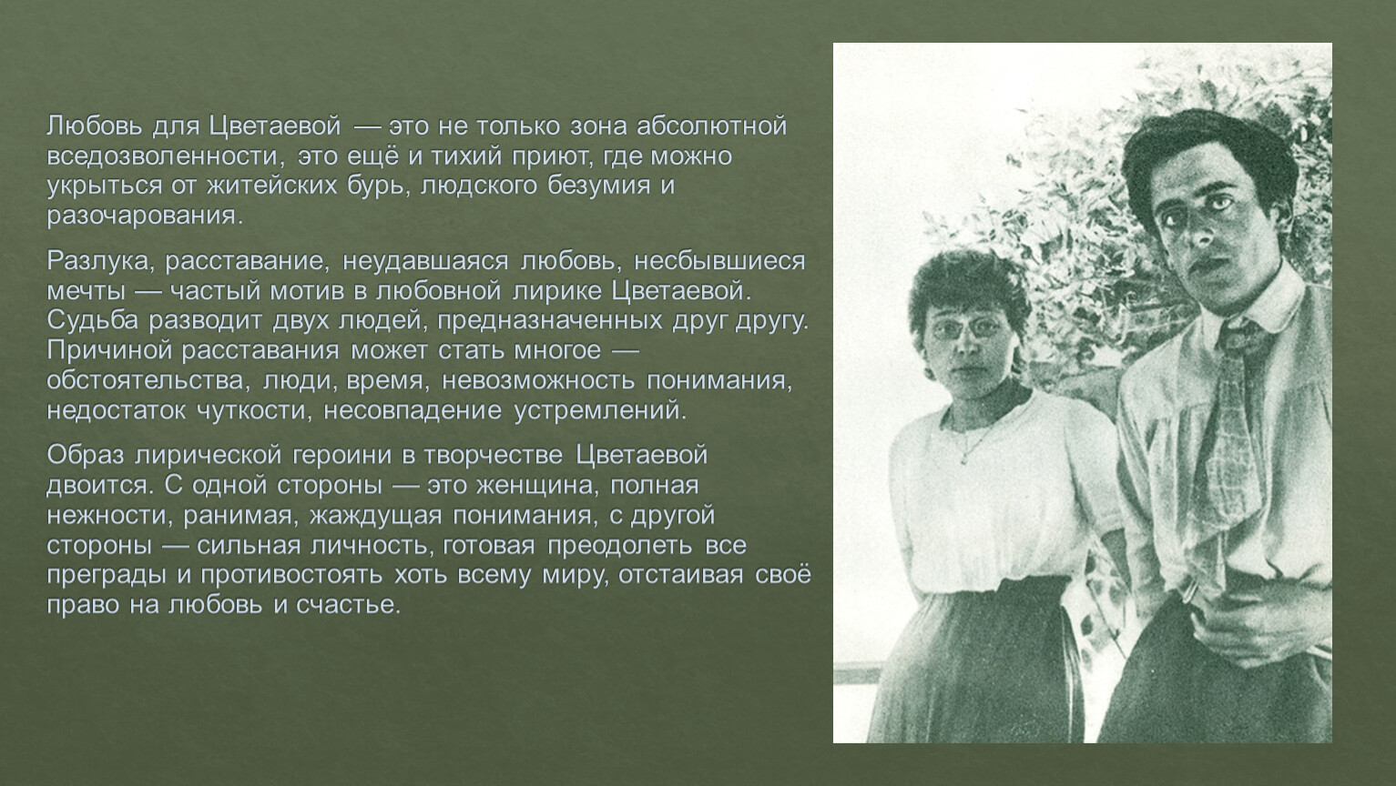 Образ лирической героини в творчестве Цветаевой двоится. С одной стороны — это женщина, полная нежности, ранимая, жаждущая понимания, с другой стороны — сильная личность, готовая преодолеть все преграды и противостоять хоть всему миру, отстаивая своё право на любовь и счастье.