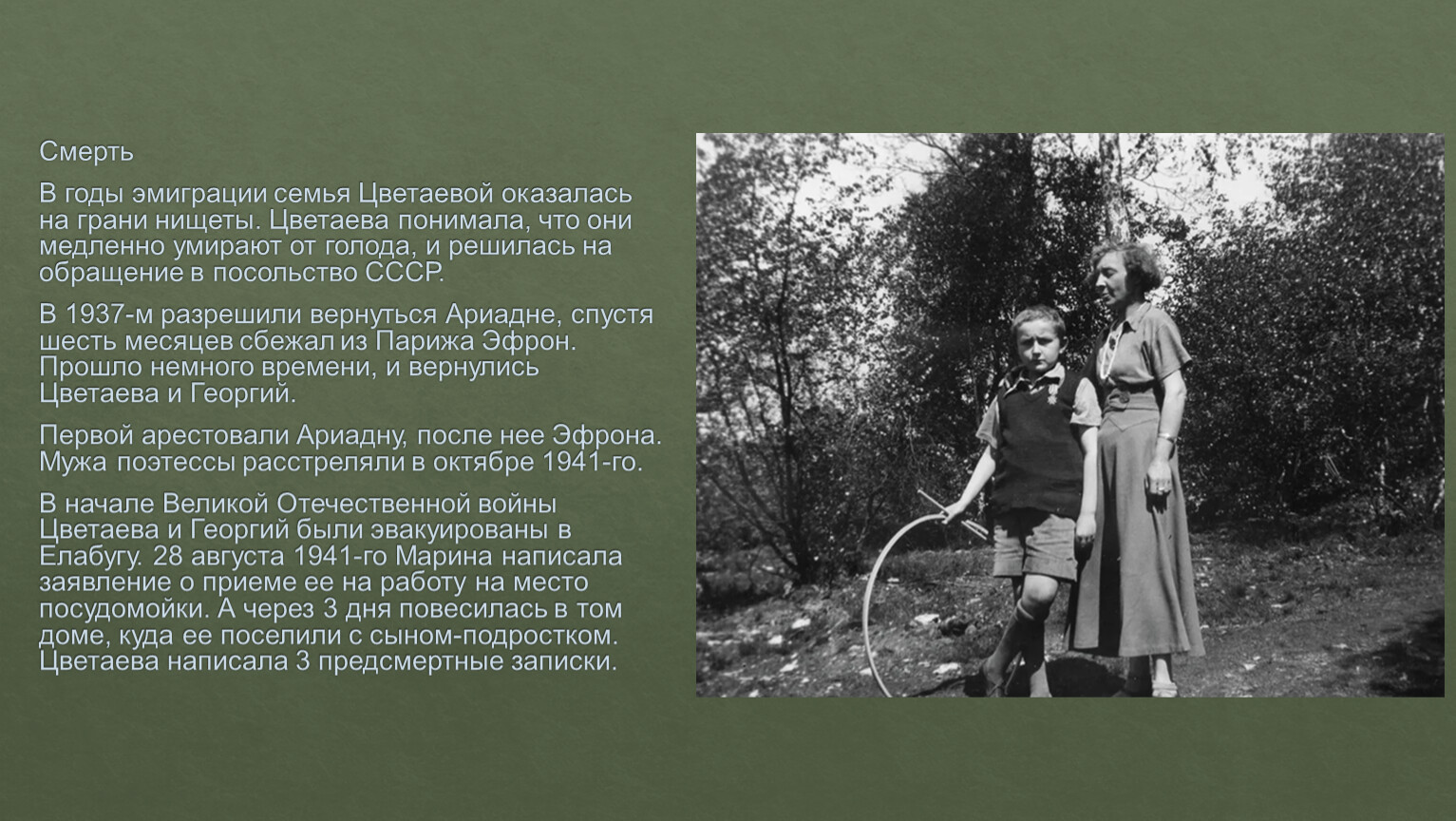 В начале Великой Отечественной войны Цветаева и Георгий были эвакуированы в Елабугу. 28 августа 1941-го Марина написала заявление о приеме ее на работу на место посудомойки. А через 3 дня повесилась в том доме, куда ее поселили с сыном-подростком. Цветаева написала 3 предсмертные записки.