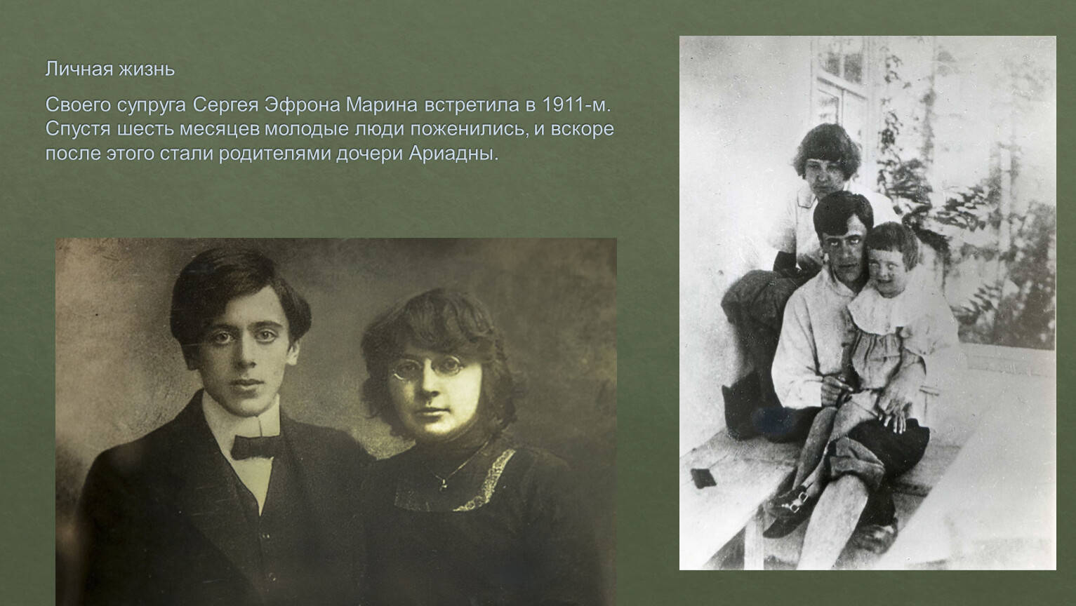 Своего супруга Сергея Эфрона Марина встретила в 1911-м. Спустя шесть месяцев молодые люди поженились, и вскоре после этого стали родителями дочери Ариадны.
