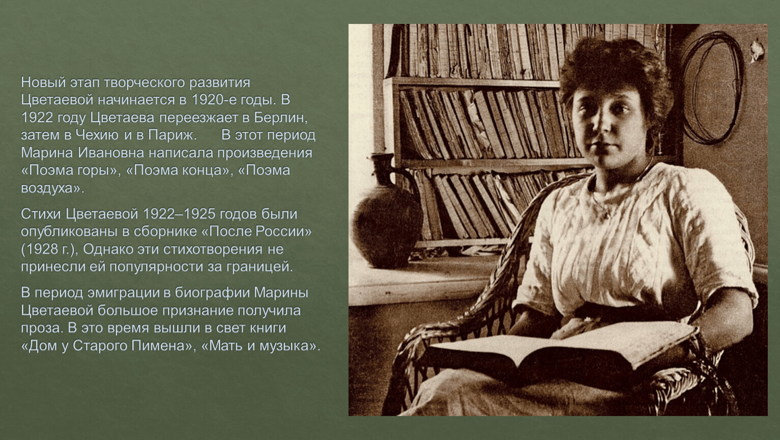 В период эмиграции в биографии Марины Цветаевой большое признание получила проза. В это время вышли в свет книги «Дом у Старого Пимена», «Мать и музыка».