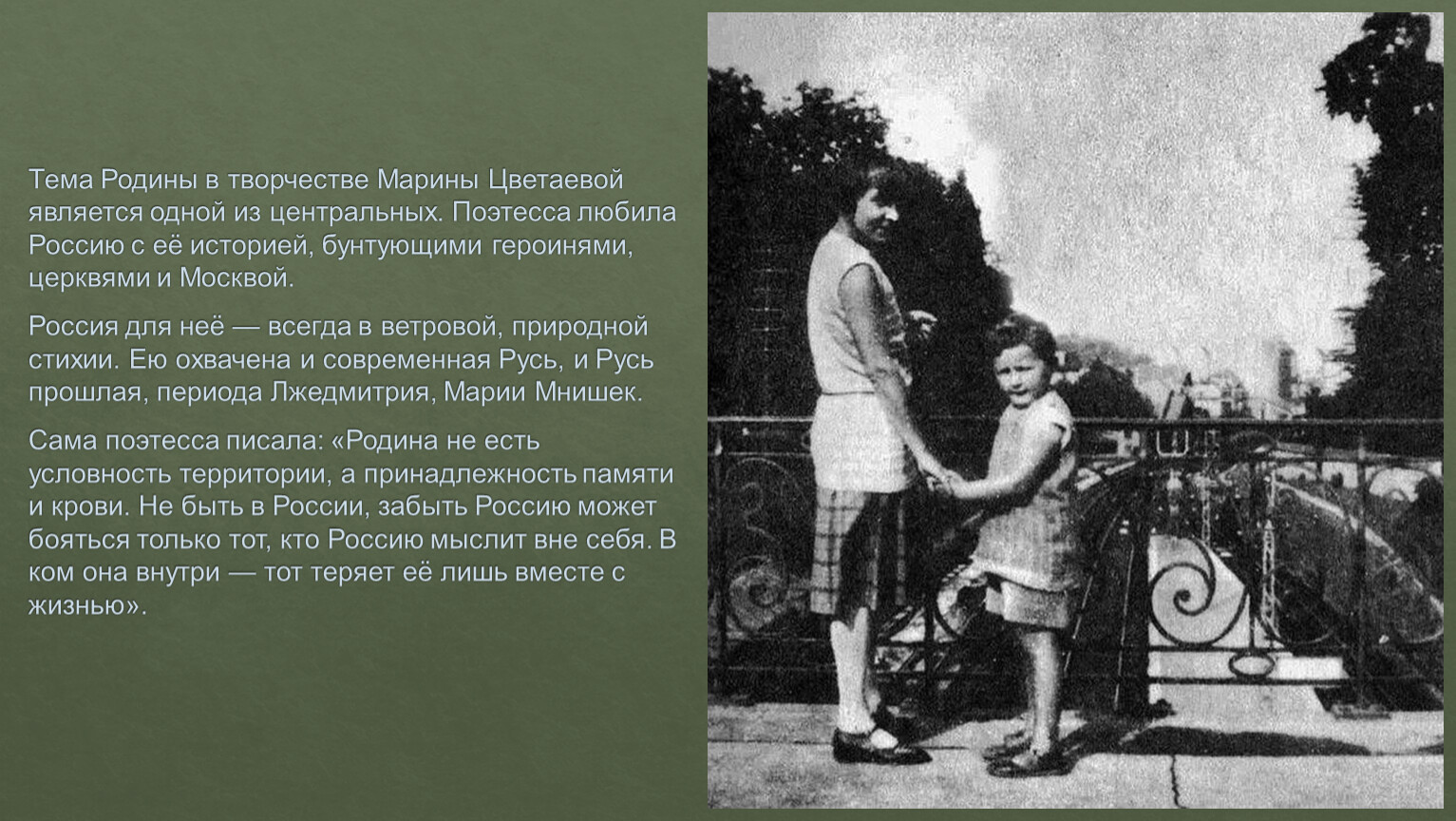 Тема Родины в творчестве Марины Цветаевой является одной из центральных. Поэтесса любила Россию с её историей, бунтующими героинями, церквями и Москвой.
