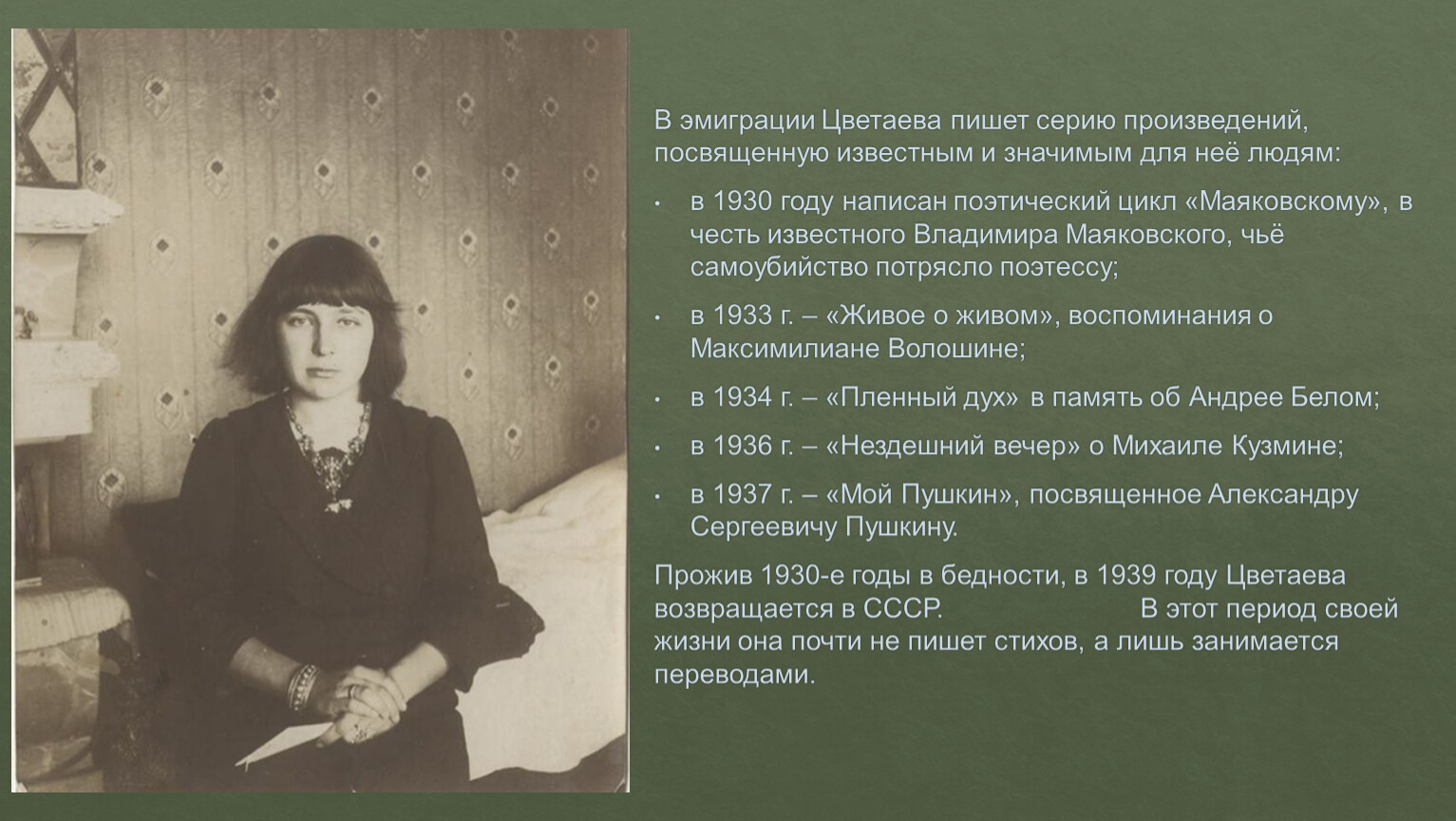 В эмиграции Цветаева пишет серию произведений, посвященную известным и значимым для неё людям: