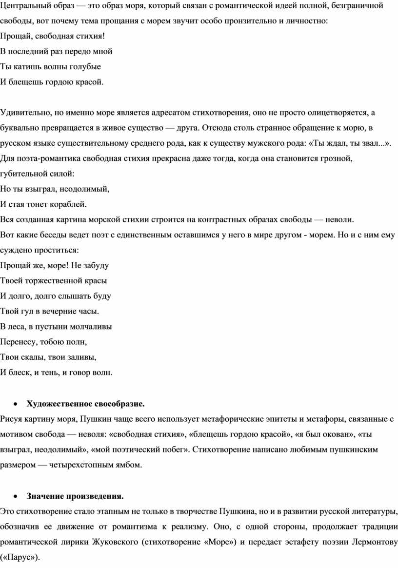 Стихотворение «К морю» насыщено романтическими темами, мотивами и образами. В нем поэт не только создает прекрасную картину морской стихии, но прежде всего выражает свои самые заветные думы и чувства, наполняя стихотворение глубокими философскими размышлениями о жизни и смерти, свободе и неволе, человеческой судьбе.