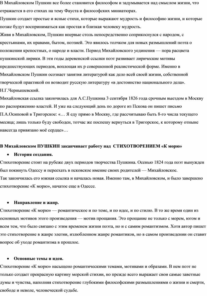 В Михайловском Пушкин все более становится философом и задумывается над смыслом жизни, что отражается в его стихах на тему Фауста и философских миниатюрах.