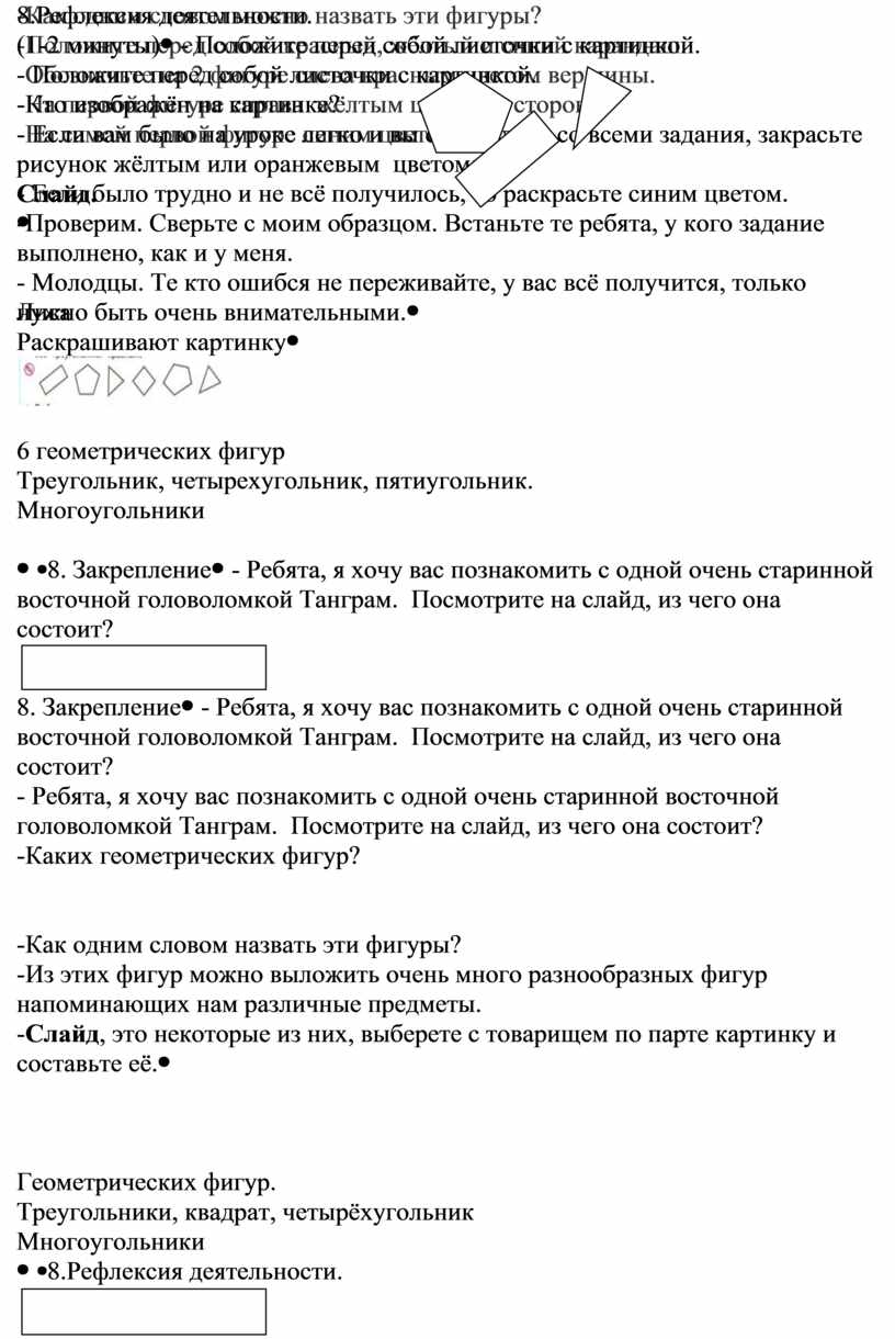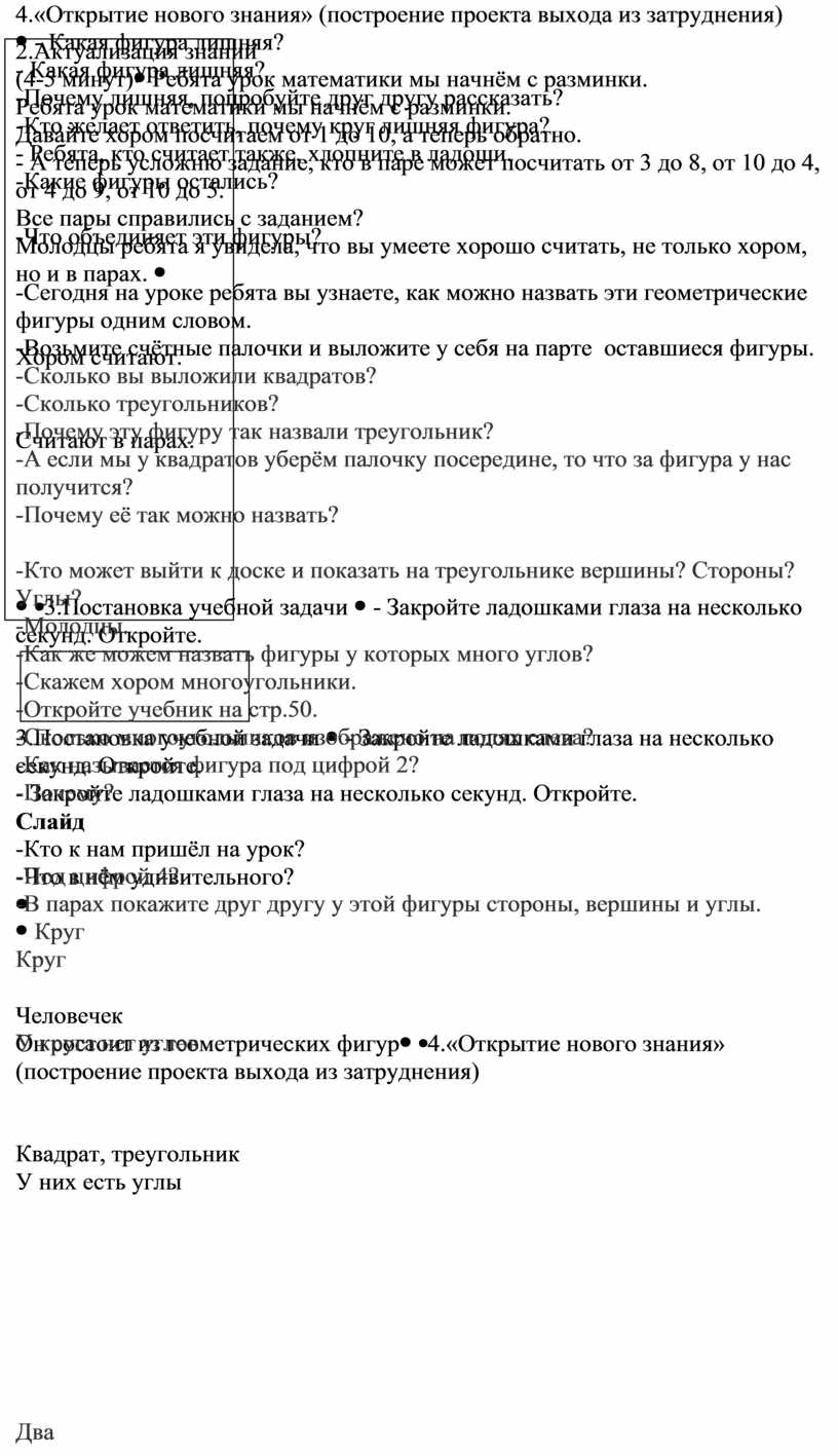 -Сегодня на уроке ребята вы узнаете, как можно назвать эти геометрические фигуры одним словом. -Возьмите счётные палочки и выложите у себя на парте оставшиеся фигуры. -Сколько вы выложили квадратов? -Сколько треугольников? -Почему эту фигуру так назвали треугольник? -А если мы у квадратов уберём палочку посередине, то что за фигура у нас получится? -Почему её так можно назвать?