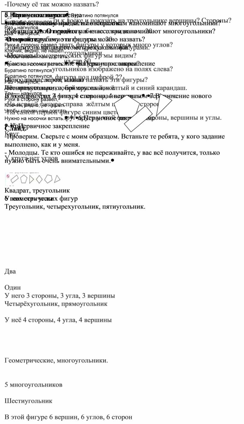 - учить показывать углы, вершины и стороны многоугольников;