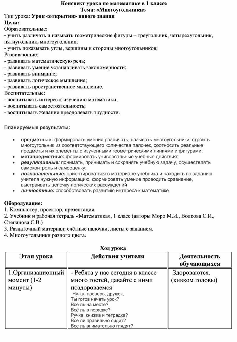 Конспект урока по математике в 1 классе