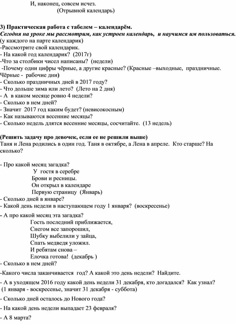 В ходе практической работы научить детей пользоваться табелем-календарём.