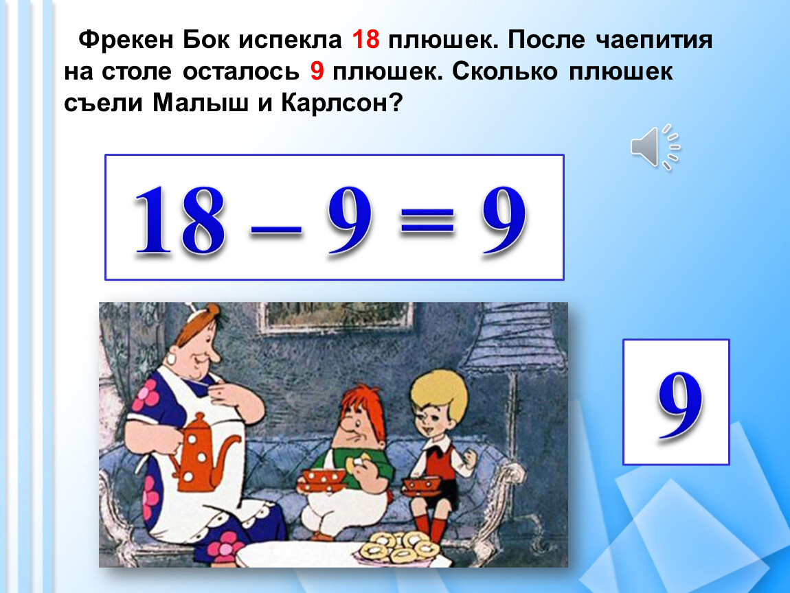 Фрекен Бок испекла 18 плюшек. После чаепития