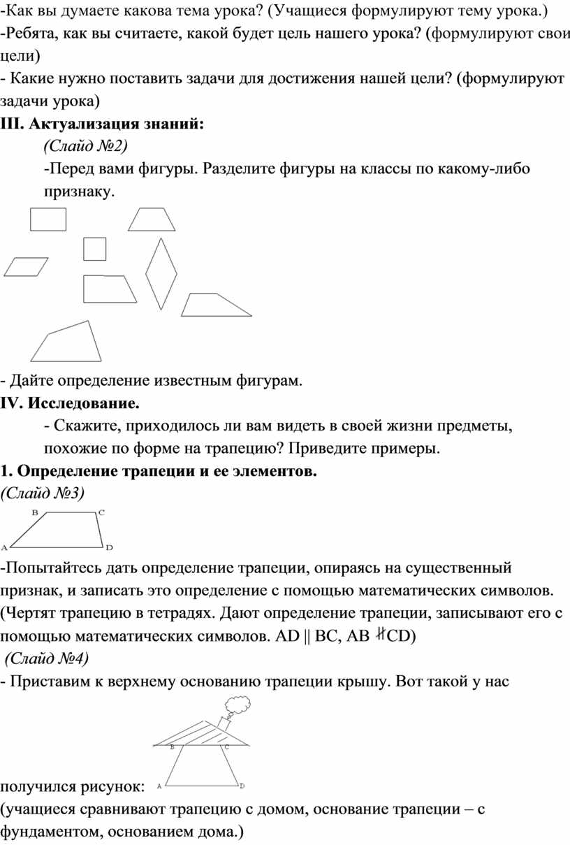 (учащиеся сравнивают трапецию с домом, основание трапеции – с фундаментом, основанием дома.)