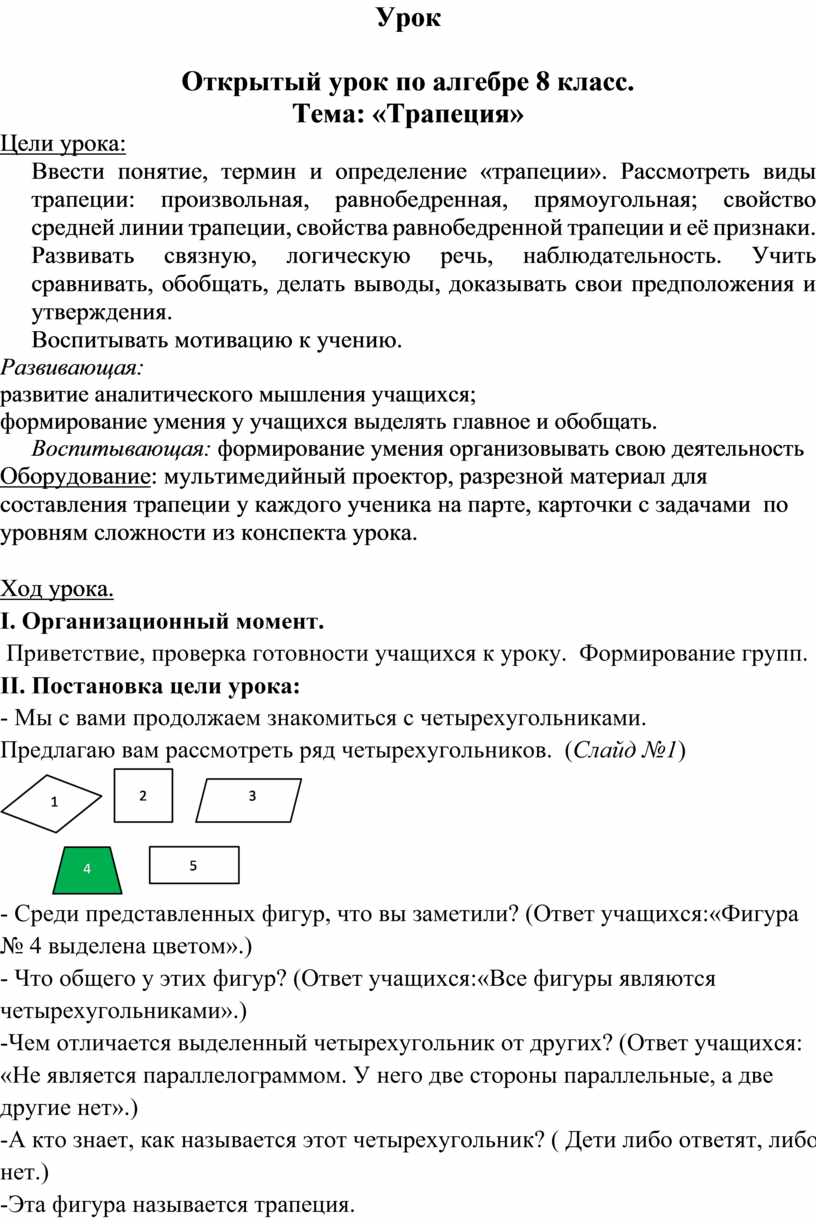 Оборудование: мультимедийный проектор, разрезной материал для составления трапеции у каждого ученика на парте, карточки с задачами по уровням сложности из конспекта урока.