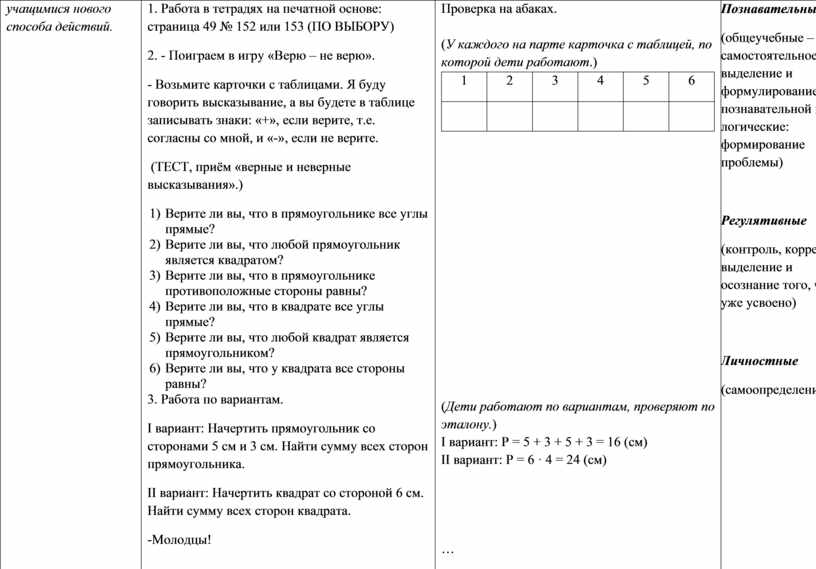 1. Работа в тетрадях на печатной основе: страница 49 № 152 или 153 (ПО ВЫБОРУ) 2. - Поиграем в игру «Верю – не верю». - Возьмите карточки с таблицами. Я буду говорить высказывание, а вы будете в таблице записывать знаки: «+», если верите, т.е. согласны со мной, и «-», если не верите. (ТЕСТ, приём «верные и неверные высказывания».) 1) Верите ли вы, что в прямоугольнике все углы прямые? 2) Верите ли вы, что любой прямоугольник является квадратом? 3) Верите ли вы, что в прямоугольнике противоположные стороны равны? 4) Верите ли вы, что в квадрате все углы прямые? 5) Верите ли вы, что любой квадрат является прямоугольником? 6) Верите ли вы, что у квадрата все стороны равны? 3. Работа по вариантам. I вариант: Начертить прямоугольник со сторонами 5 см и 3 см. Найти сумму всех сторон прямоугольника. II вариант: Начертить квадрат со стороной 6 см. Найти сумму всех сторон квадрата. -Молодцы! - Какое домашнее задание можете предложить своему соседу по теме урока? |