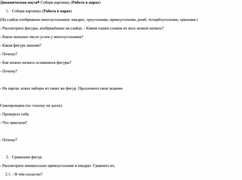 - Многоугольники. - 3 угла. - Треугольник. - У него 3 угла, 3 стороны, 3 вершины. - Четырёхугольники. - У них 4 угла, 4 стороны, 4 вершины. (Работают в парах.) - Разделить на треугольники и четырёхугольники. - Разделить на прямоугольники и непрямоугольники (четырёхугольники). (Дети проверяют свою работу по эталону.) - В одной группе оказались прямоугольники и квадраты. - Потому что у этих фигур прямые углы.