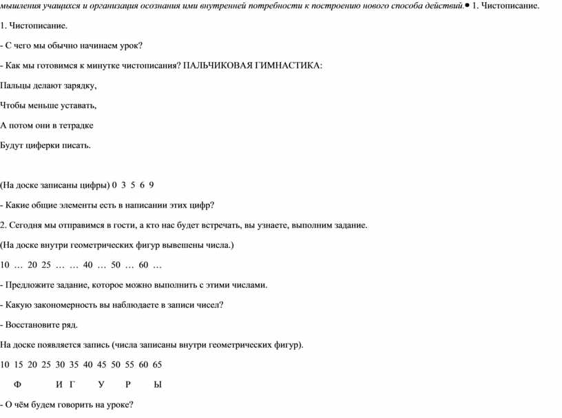 (На доске записаны цифры) 0 3 5 6 9 - Какие общие элементы есть в написании этих цифр? 2. Сегодня мы отправимся в гости, а кто нас будет встречать, вы узнаете, выполним задание. (На доске внутри геометрических фигур вывешены числа.) 10 … 20 25 … … 40 … 50 … 60 … - Предложите задание, которое можно выполнить с этими числами. - Какую закономерность вы наблюдаете в записи чисел? - Восстановите ряд. На доске появляется запись (числа записаны внутри геометрических фигур). 10 15 20 25 30 35 40 45 50 55 60 65 Ф И Г У Р Ы - О чём будем говорить на уроке? - Как догадались? - Как называется наука, которая изучает геометрические фигуры? |