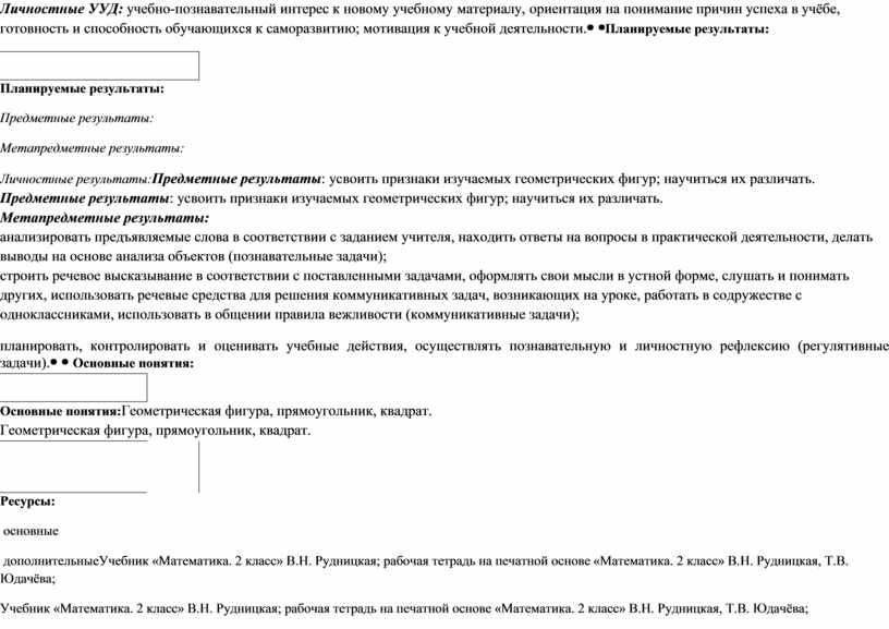 Образовательные: 1. Сформировать представление детей о геометрических фигурах: прямоугольнике и квадрате; показать их сходство и отличие. 2. Сформировать навык определения фигур по сторонам и углам. Развивающие: 1. Способствовать развитию пространственного мышления. 2. Содействовать развитию речевых навыков детей. Воспитательные: 1. Воспитывать стремление применять новое знание на практике. 2. Воспитывать интерес учащихся математике. 3. Формировать исследовательские умения. |