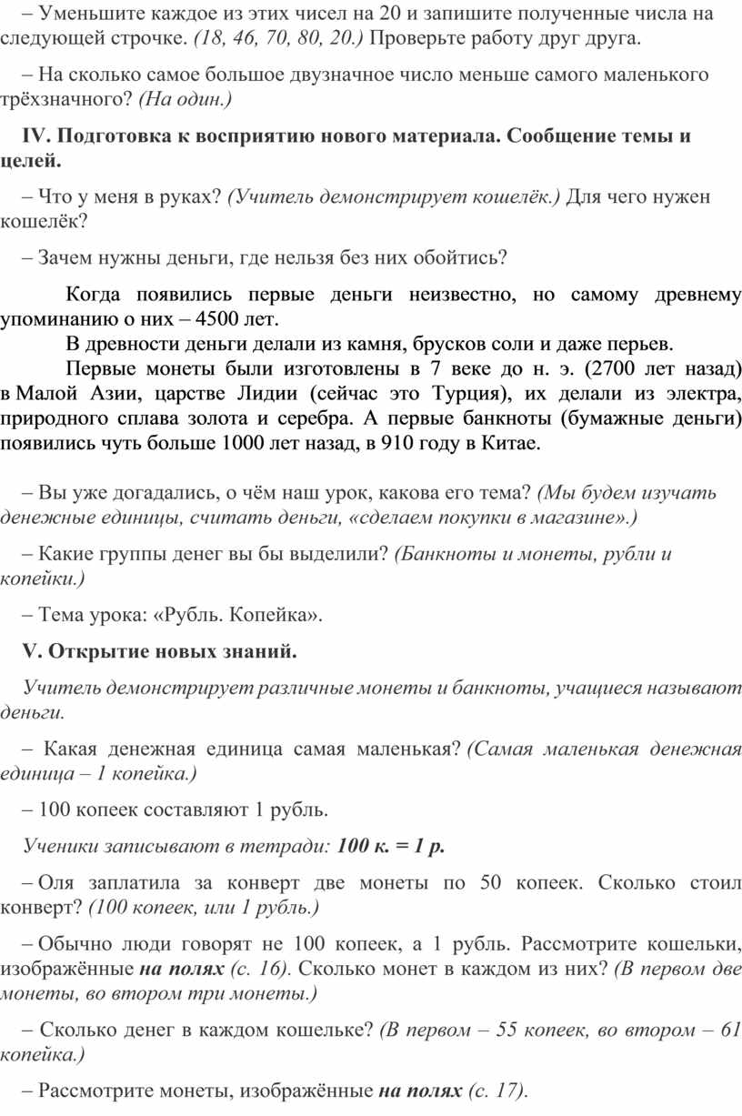 Цель: познакомить с денежными единицами – рублём и копейкой; показать, что в одном рубле содержится 100 копеек; развивать навыки счёта; закреплять умение преобразовывать величины, решать задачи изученных видов; развивать логическое мышление.