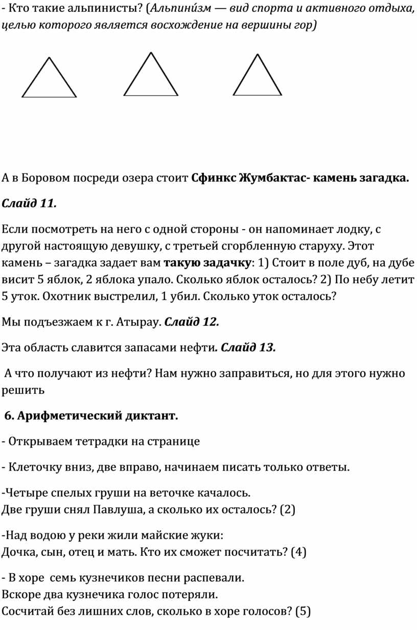 2. Начальная мотивация. Слайд 1 - У нас сегодня необычный урок. Мы с вами отправимся в путешествие по нашей стране, а заодно повторим нумерацию чисел и действия над числами первого десятка. - А как называется наша страна? (Казахстан) Слайд 2 -Чтобы узнать, на чем мы отправимся в путешествие, нам нужно решить цепочку действий. (в группах) - А путешествовать мы отправимся на школьном автобусе, который стоит первым в ряду .Слайд 3
