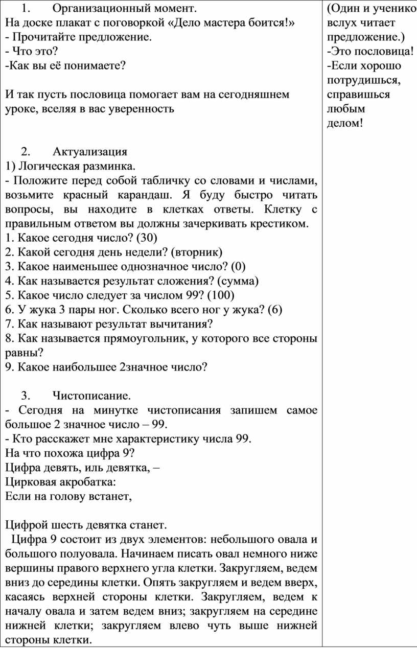 2. Актуализация 1) Логическая разминка. - Положите перед собой табличку со словами и числами, возьмите красный карандаш. Я буду быстро читать вопросы, вы находите в клетках ответы. Клетку с правильным ответом вы должны зачеркивать крестиком. 1. Какое сегодня число? (30) 2. Какой сегодня день недели? (вторник) 3. Какое наименьшее однозначное число? (0) 4. Как называется результат сложения? (сумма) 5. Какое число следует за числом 99? (100) 6. У жука 3 пары ног. Сколько всего ног у жука? (6) 7. Как называют результат вычитания? 8. Как называется прямоугольник, у которого все стороны равны? 9. Какое наибольшее 2значное число?