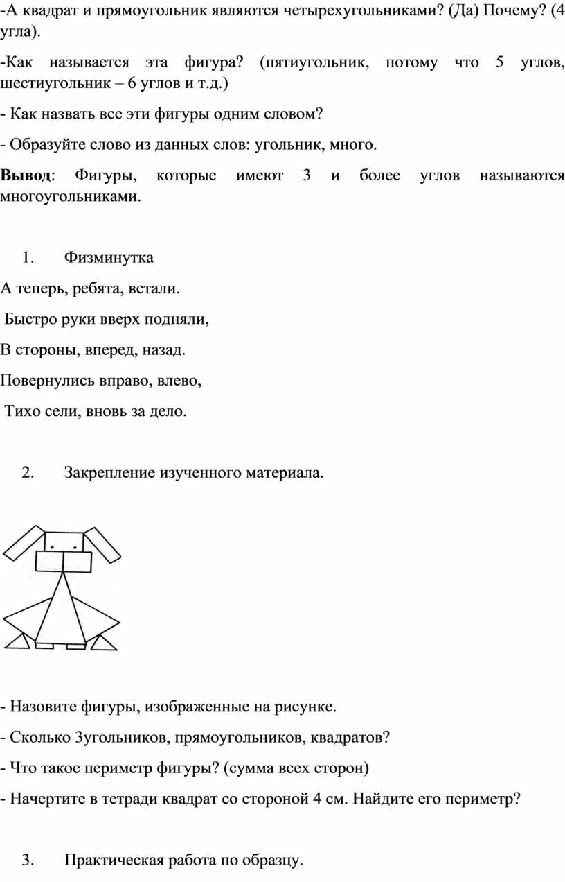 Цели: сформировать представление детей о геометрических фигурах, сформировать навык определения фигур по сторонам и углам; развивать пространственные навыки, мышление, внимание, воспитывать коммуникативные умения, познавательный интерес, веру в свои силы.