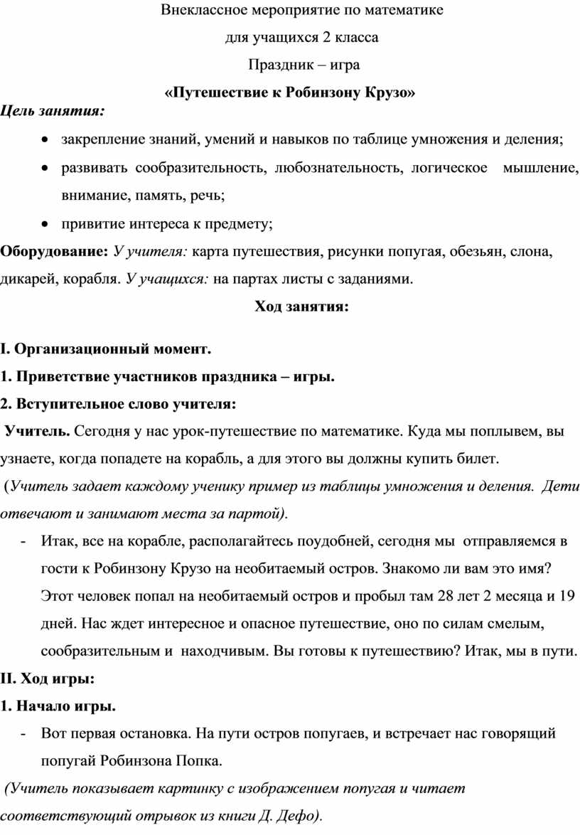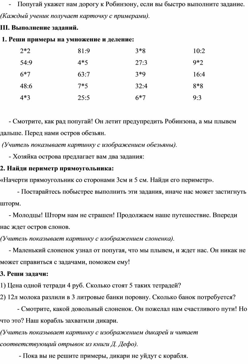 Оборудование: У учителя: карта путешествия, рисунки попугая, обезьян, слона, дикарей, корабля. У учащихся: на партах листы с заданиями.