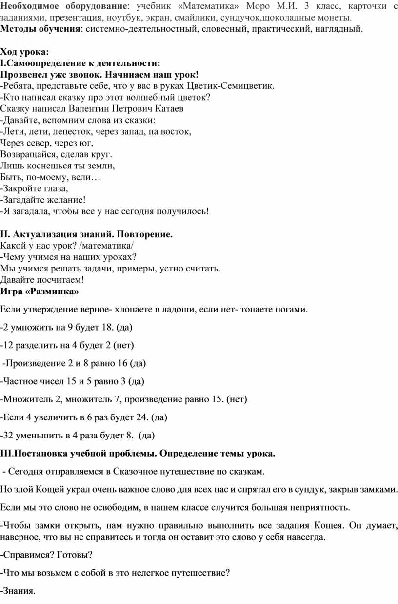 Необходимое оборудование: учебник «Математика» Моро М.И. 3 класс, карточки с заданиями, презентация, ноутбук, экран, смайлики, сундучок,шоколадные монеты.